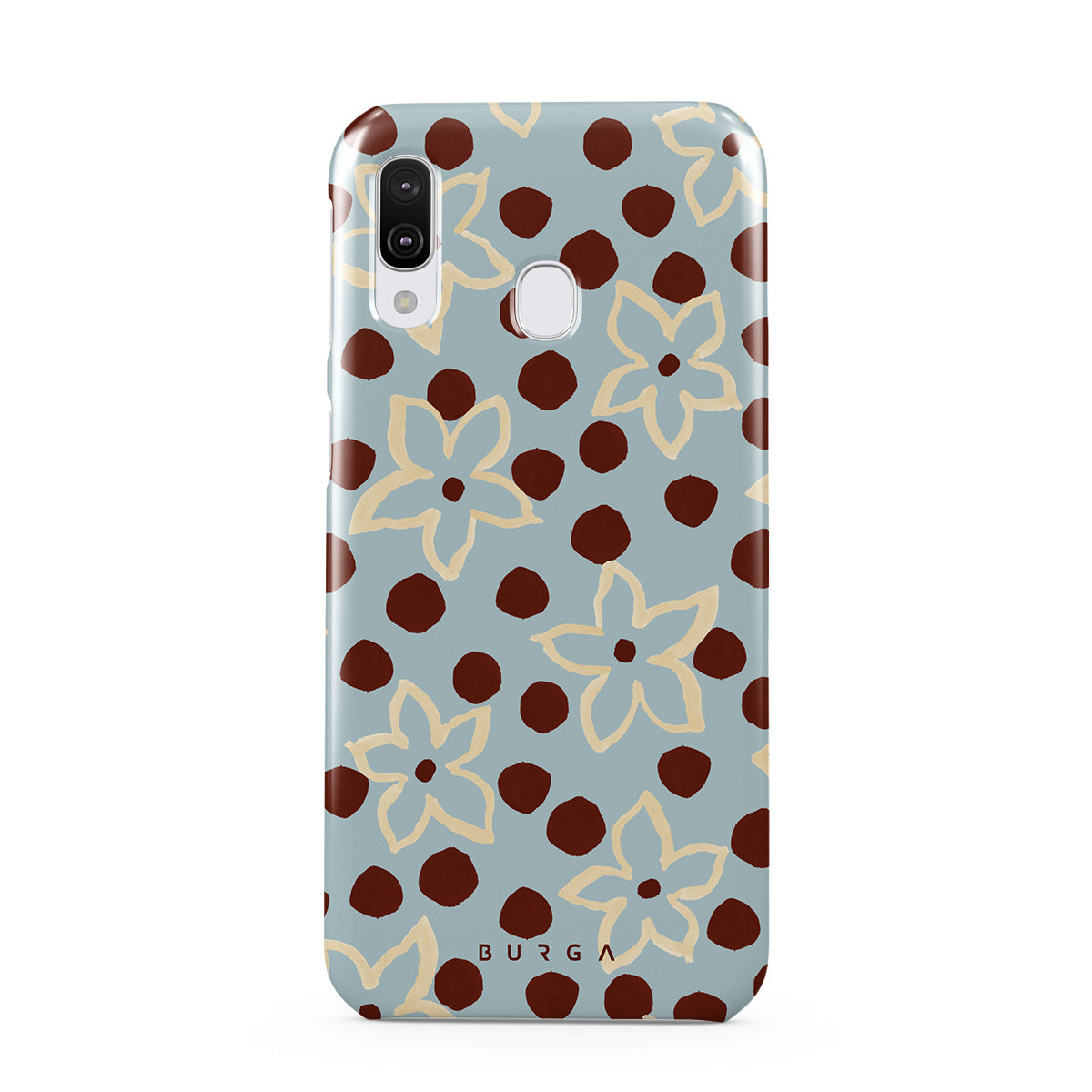 此設計特色: 花卉、點點圖案、淺藍色背景