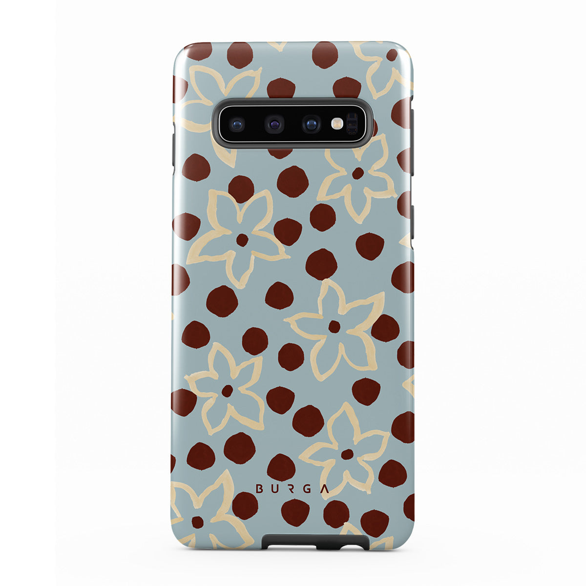 此設計特色: 花卉、點點圖案、淺藍色背景