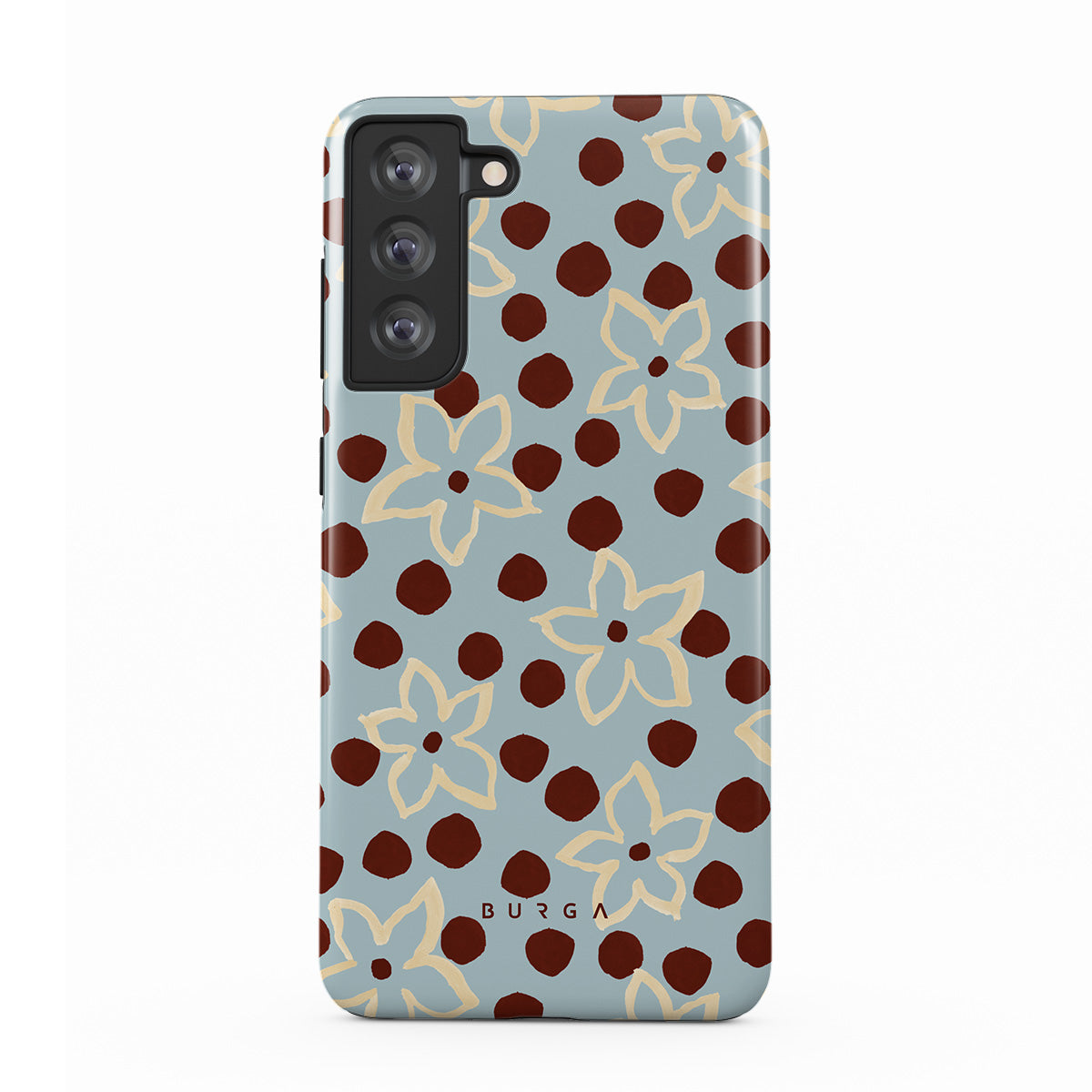 此設計特色: 花卉、點點圖案、淺藍色背景