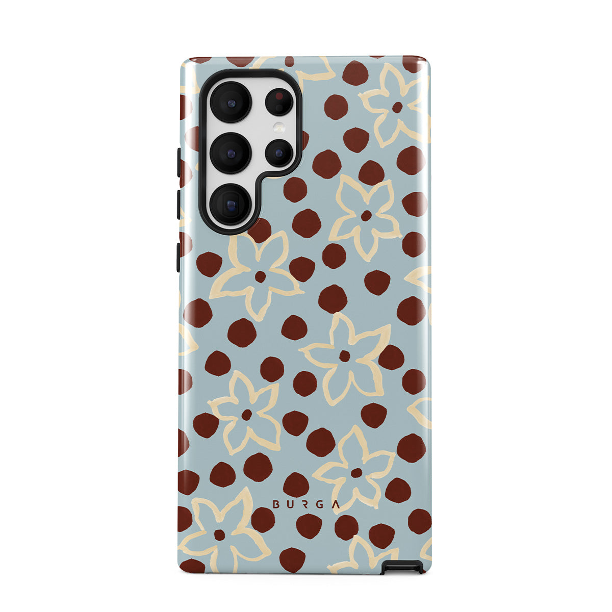 此設計特色: 花卉、點點圖案、淺藍色背景