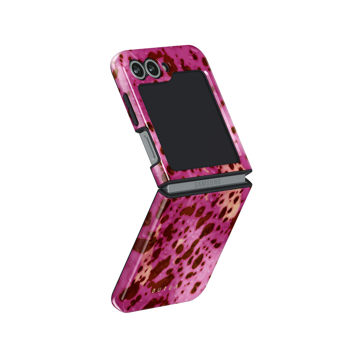 此設計特色:粉紅豹紋,品紅色背景,動物印花