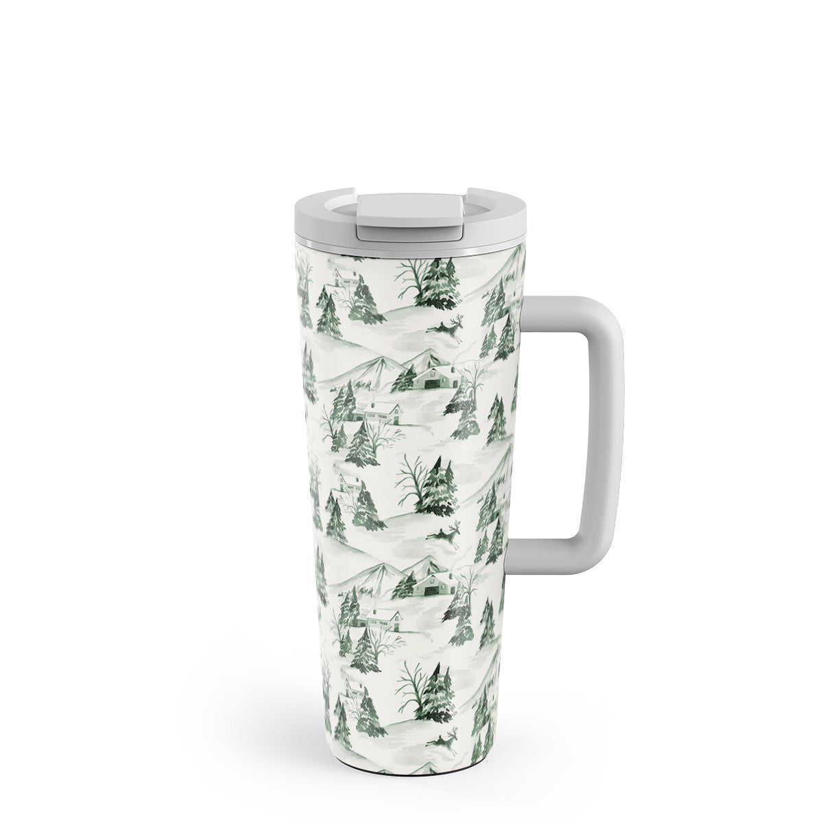 此設計特色:冬季森林景象,松樹,雪景,綠白色,自然圖案,森林聖誕,常綠樹,復古插畫風格