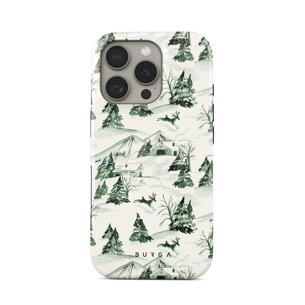 此設計特色:冬季森林景象,松樹,雪景,綠白色,自然圖案,森林聖誕,常綠樹,復古插畫風格