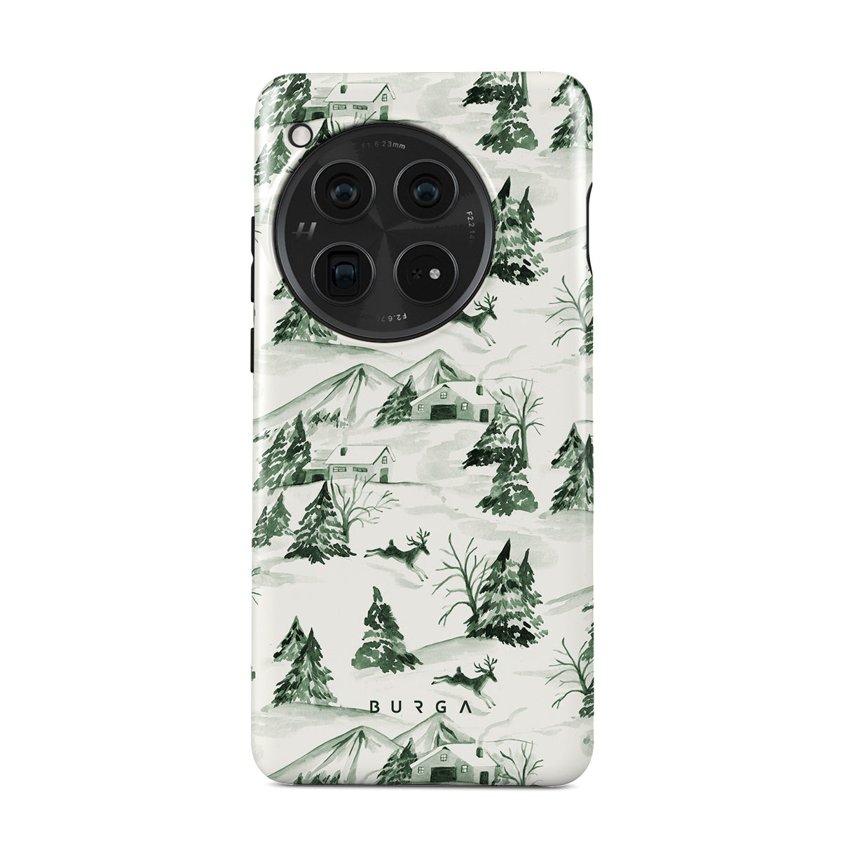 此設計特色:冬季森林景象,松樹,雪景,綠白色,自然圖案,森林聖誕,常綠樹,復古插畫風格