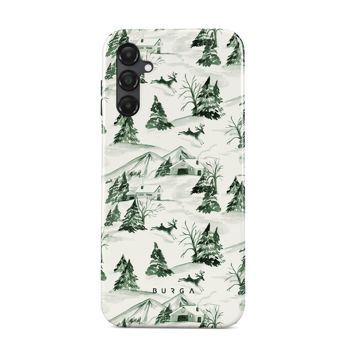 此設計特色:冬季森林景象,松樹,雪景,綠白色,自然圖案,森林聖誕,常綠樹,復古插畫風格