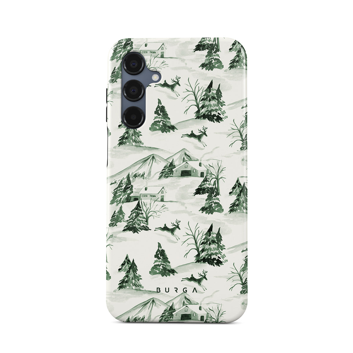 此設計特色:冬季森林景象,松樹,雪景,綠白色,自然圖案,森林聖誕,常綠樹,復古插畫風格