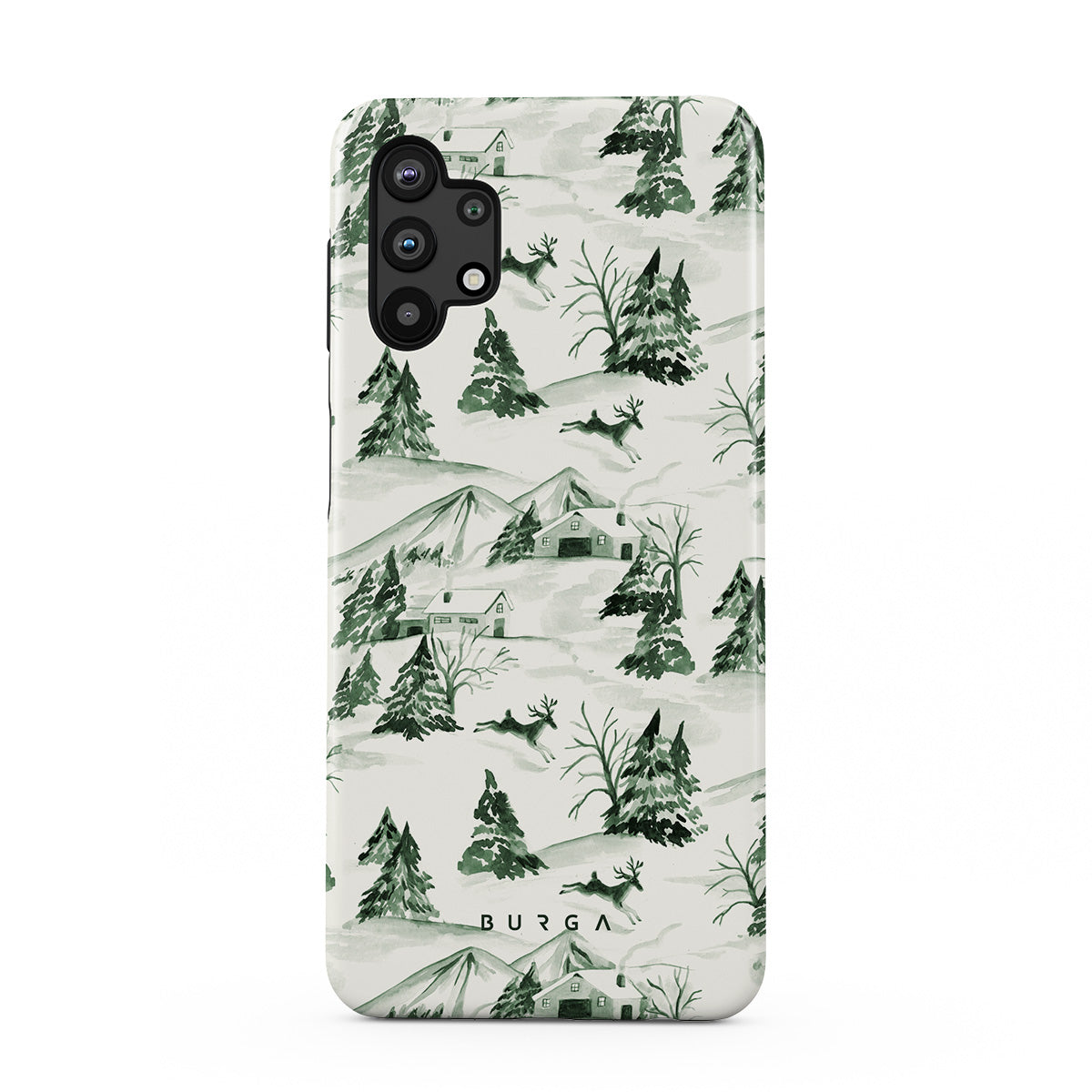 此設計特色:冬季森林景象,松樹,雪景,綠白色,自然圖案,森林聖誕,常綠樹,復古插畫風格