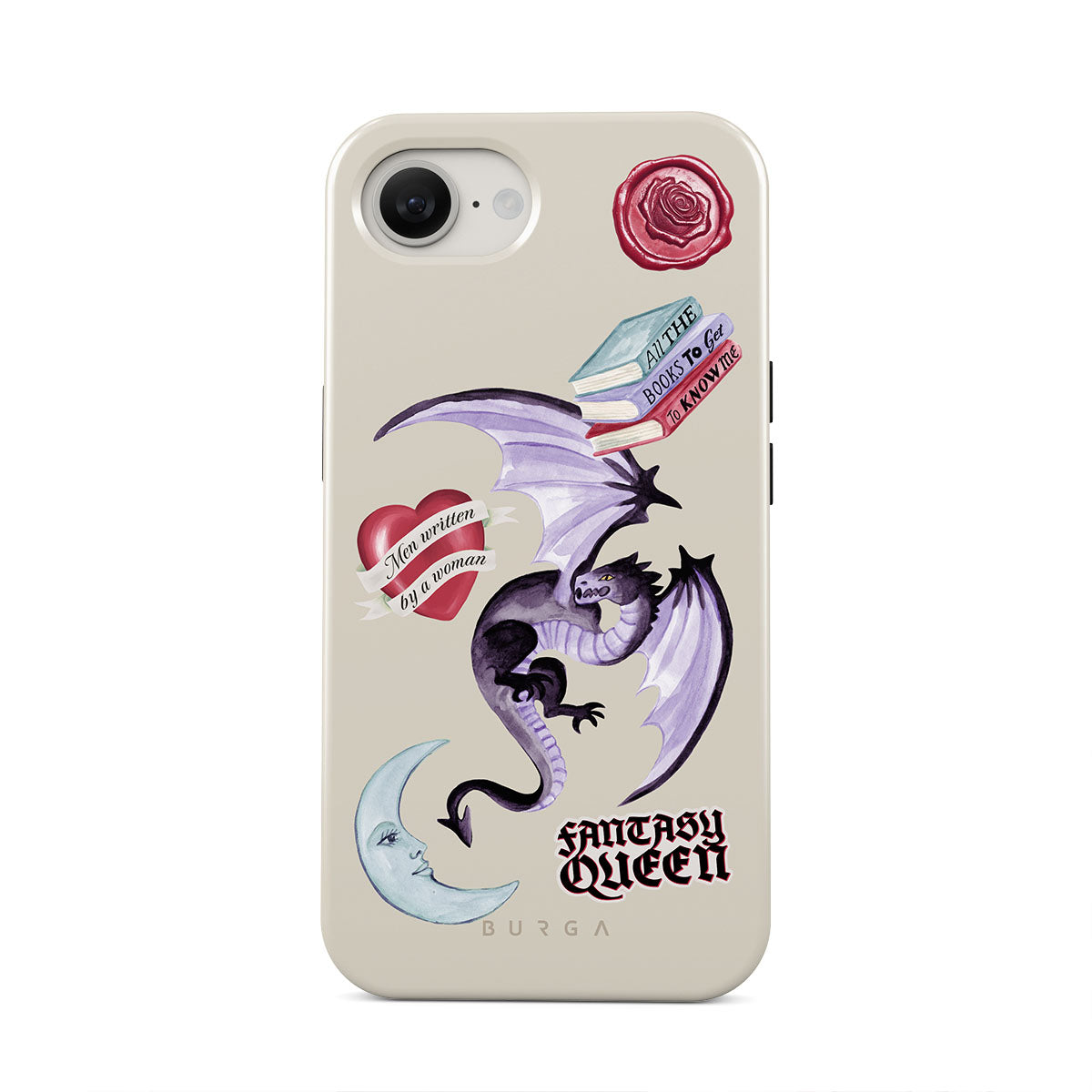 此設計特色:紫色龍、「奇幻女王」貼紙、新月、紫色封蠟、帶訊息的心、書籍