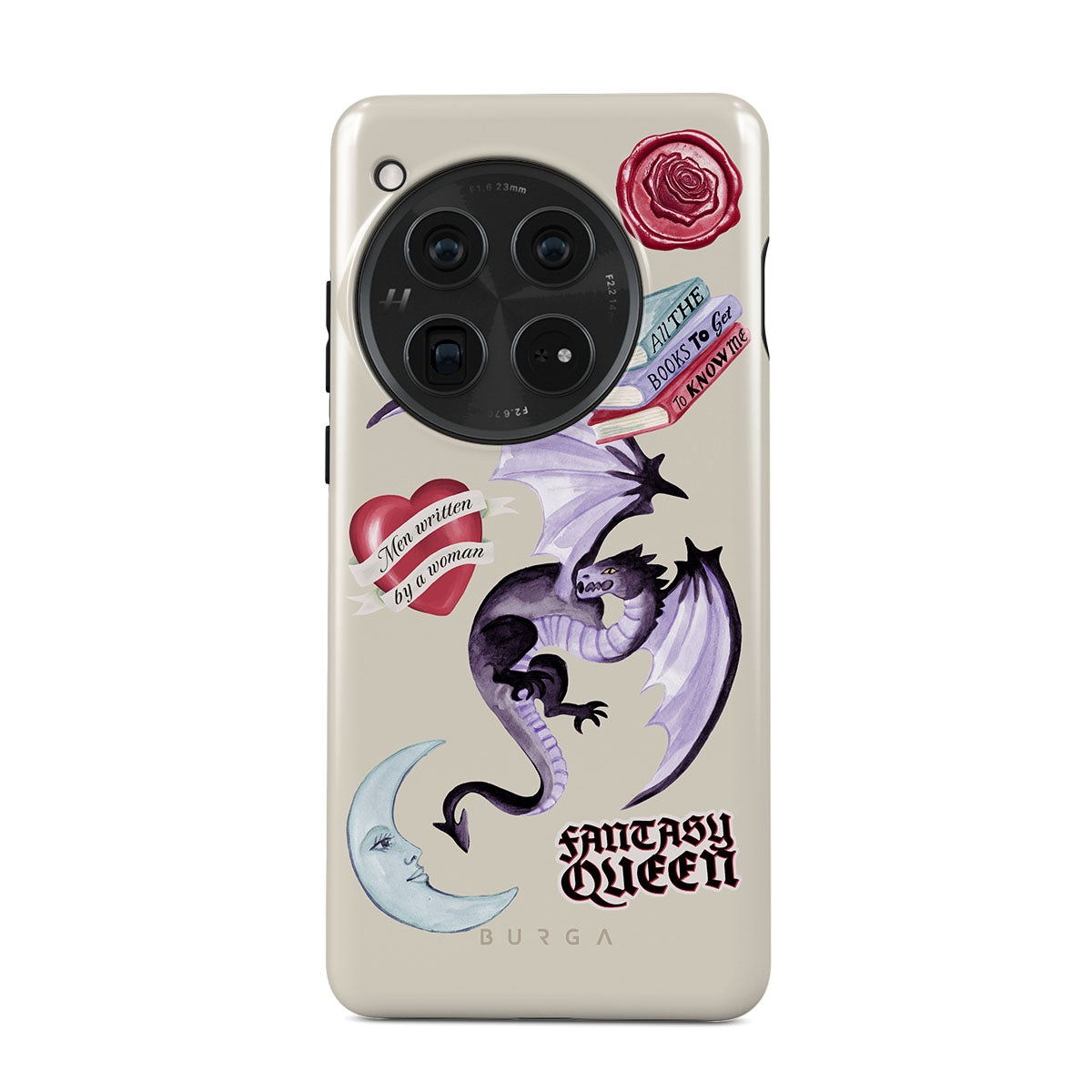 此設計特色:紫色龍、「奇幻女王」貼紙、新月、紫色封蠟、帶訊息的心、書籍