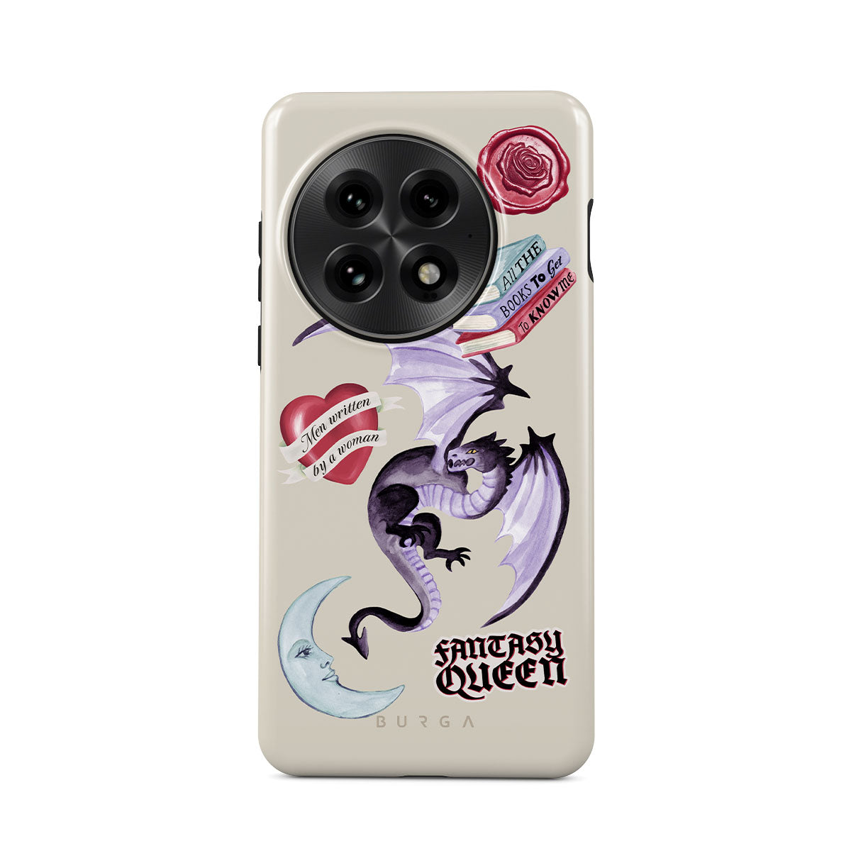 此設計特色:紫色龍、「奇幻女王」貼紙、新月、紫色封蠟、帶訊息的心、書籍