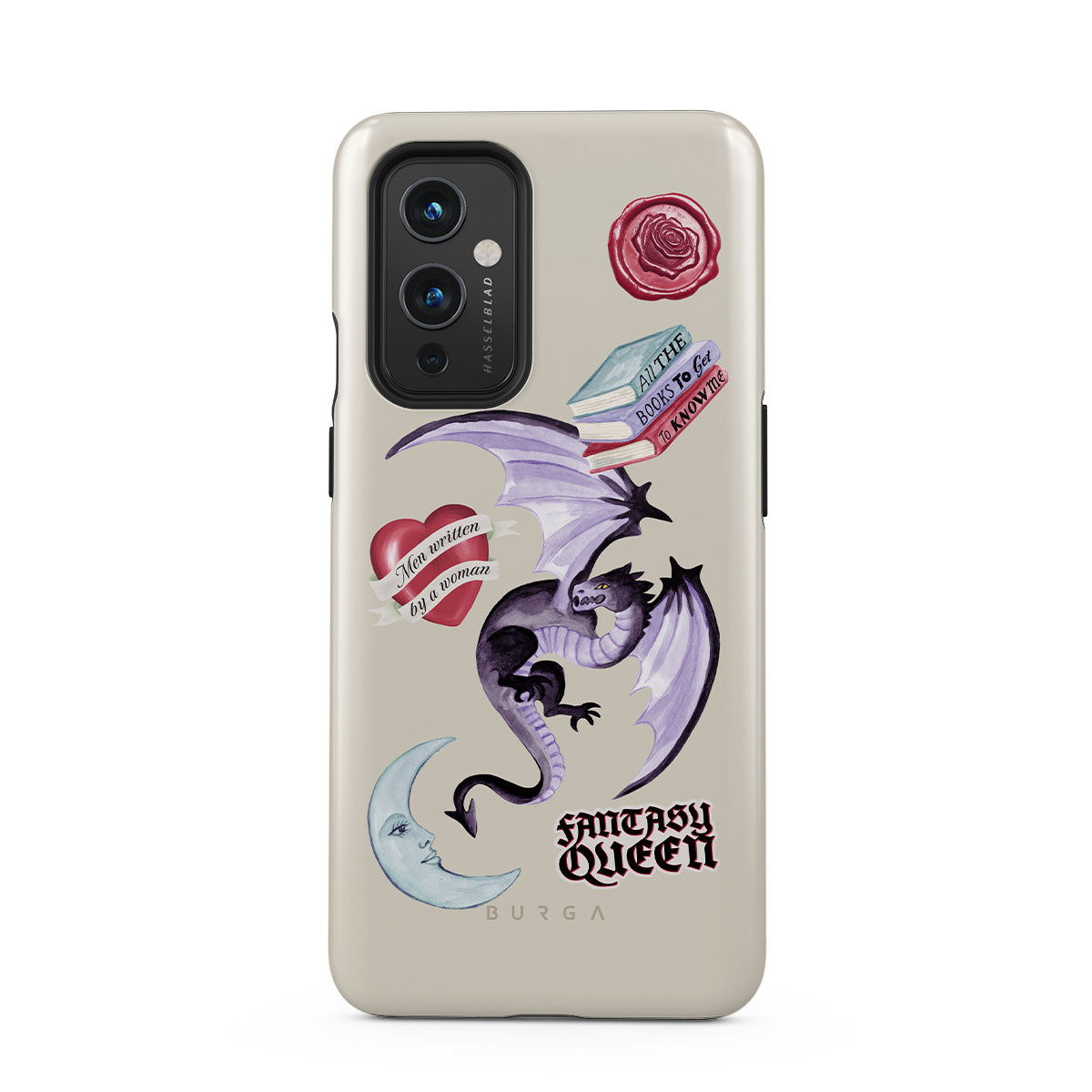 此設計特色:紫色龍、「奇幻女王」貼紙、新月、紫色封蠟、帶訊息的心、書籍