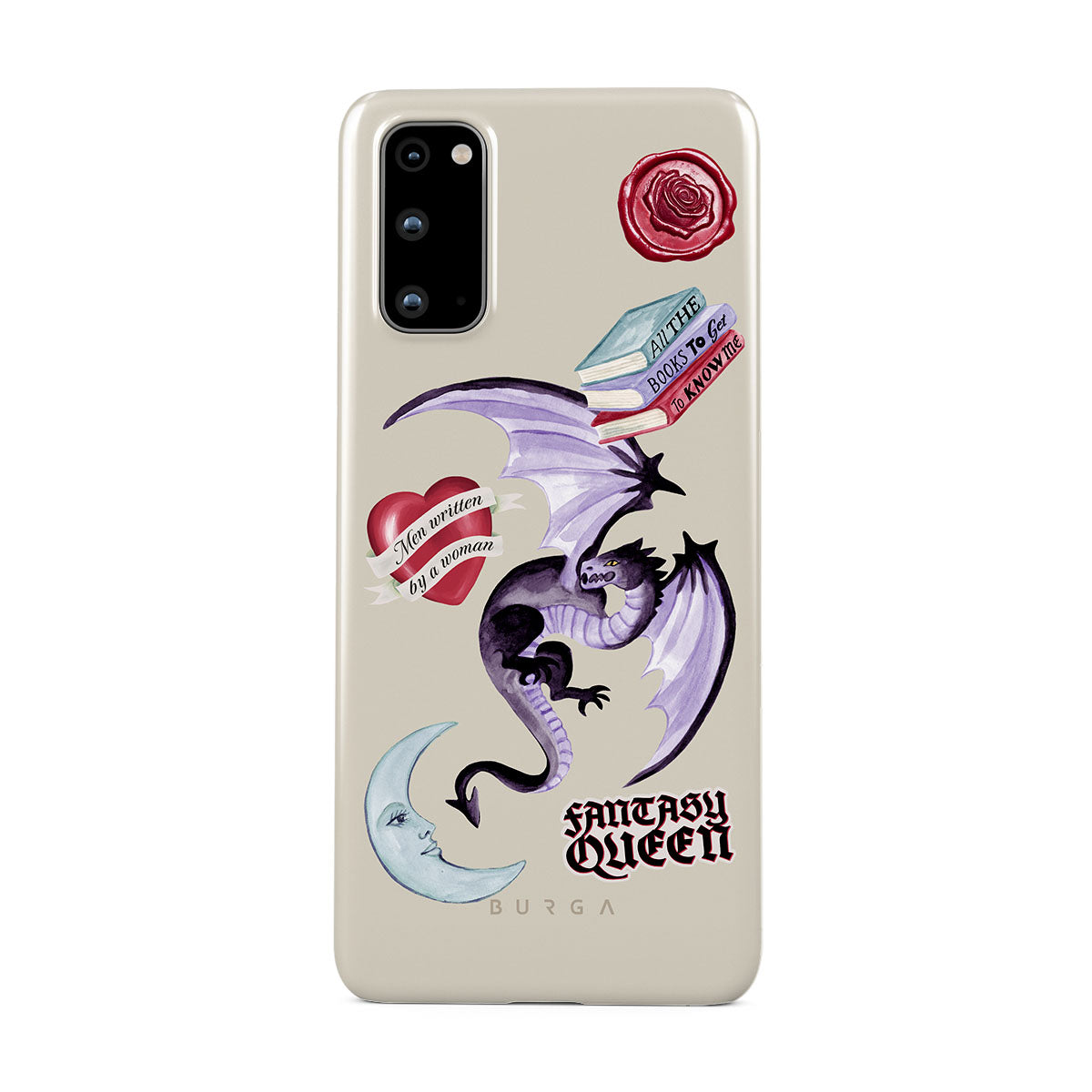 此設計特色:紫色龍、「奇幻女王」貼紙、新月、紫色封蠟、帶訊息的心、書籍