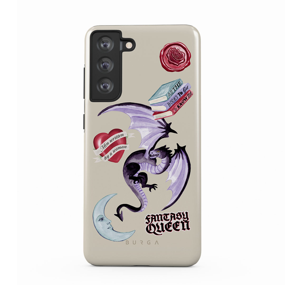 此設計特色:紫色龍、「奇幻女王」貼紙、新月、紫色封蠟、帶訊息的心、書籍