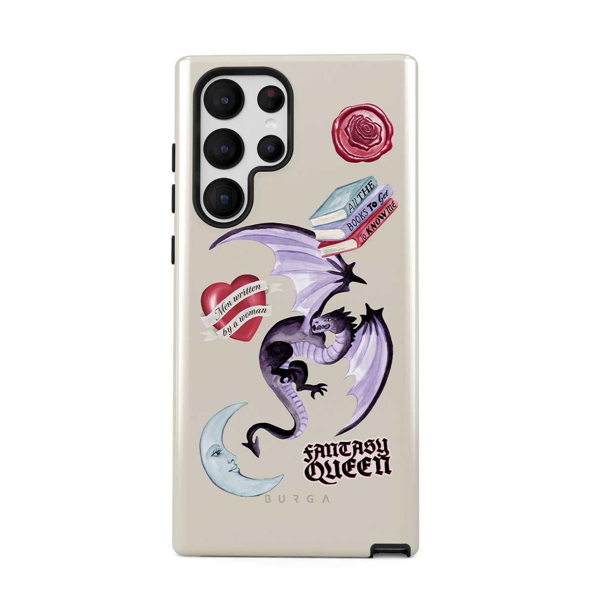 此設計特色:紫色龍、「奇幻女王」貼紙、新月、紫色封蠟、帶訊息的心、書籍