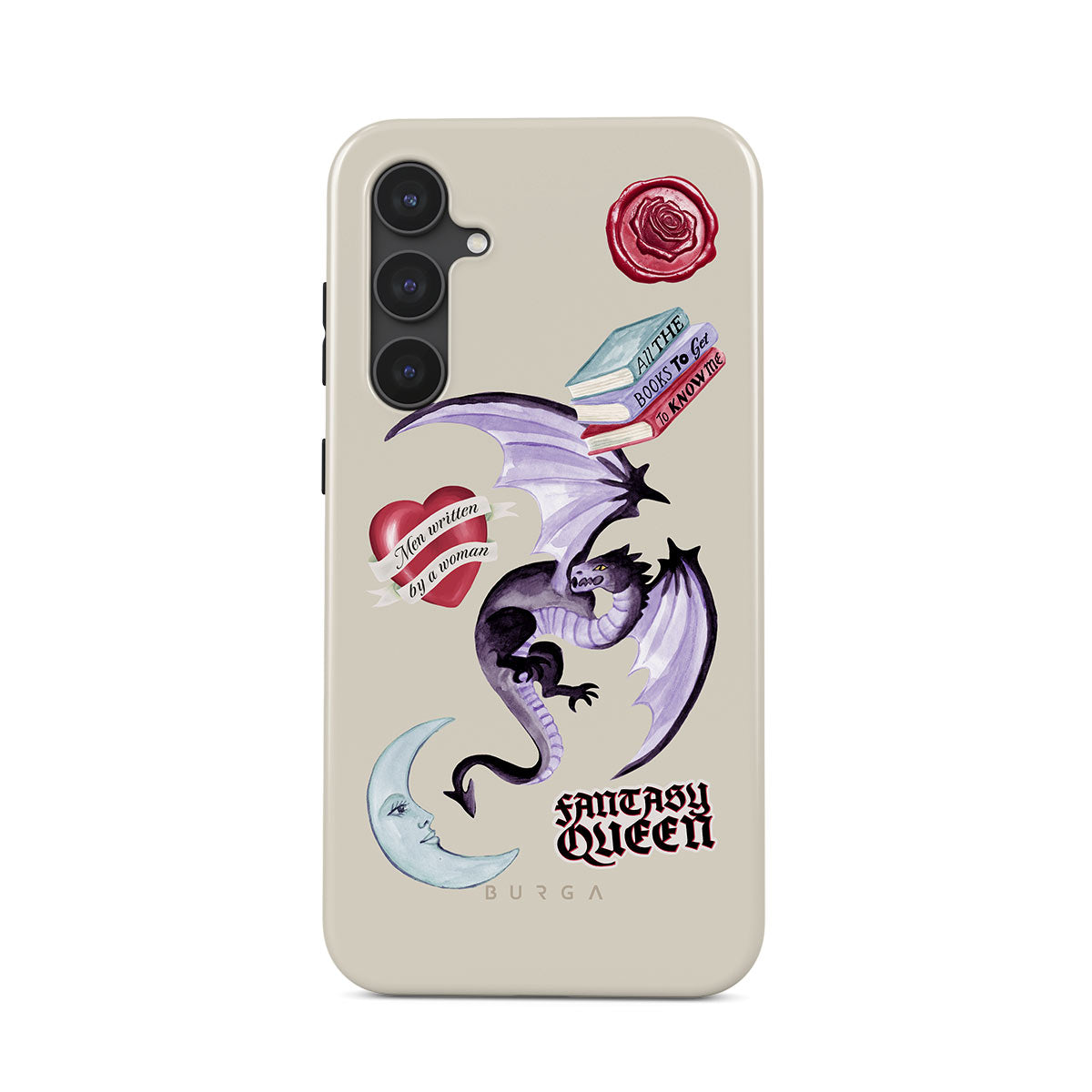 此設計特色:紫色龍、「奇幻女王」貼紙、新月、紫色封蠟、帶訊息的心、書籍