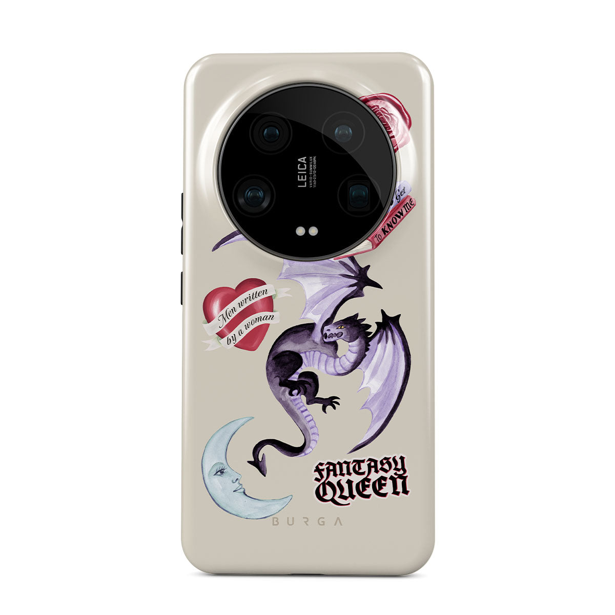 此設計特色:紫色龍、「奇幻女王」貼紙、新月、紫色封蠟、帶訊息的心、書籍