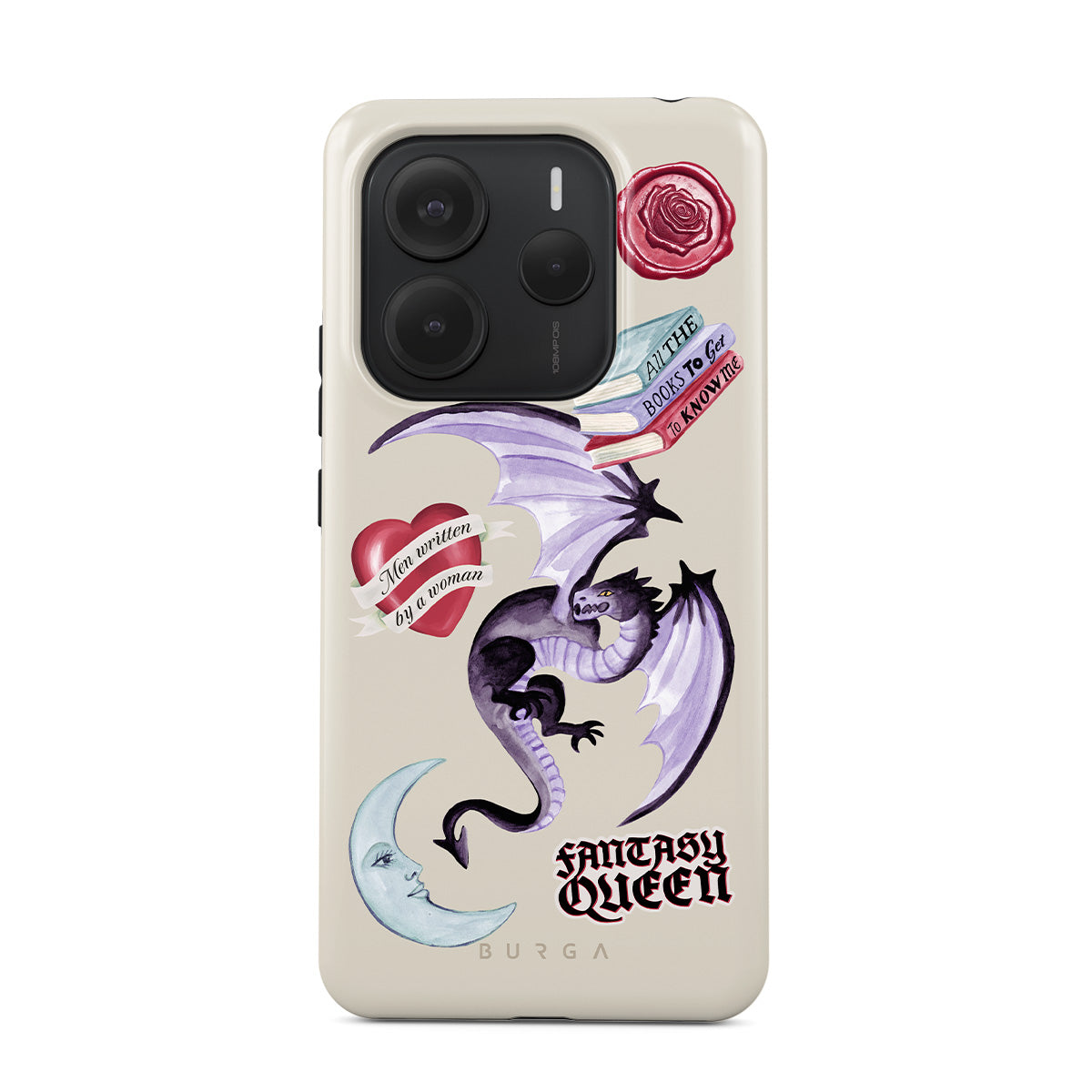 此設計特色:紫色龍、「奇幻女王」貼紙、新月、紫色封蠟、帶訊息的心、書籍