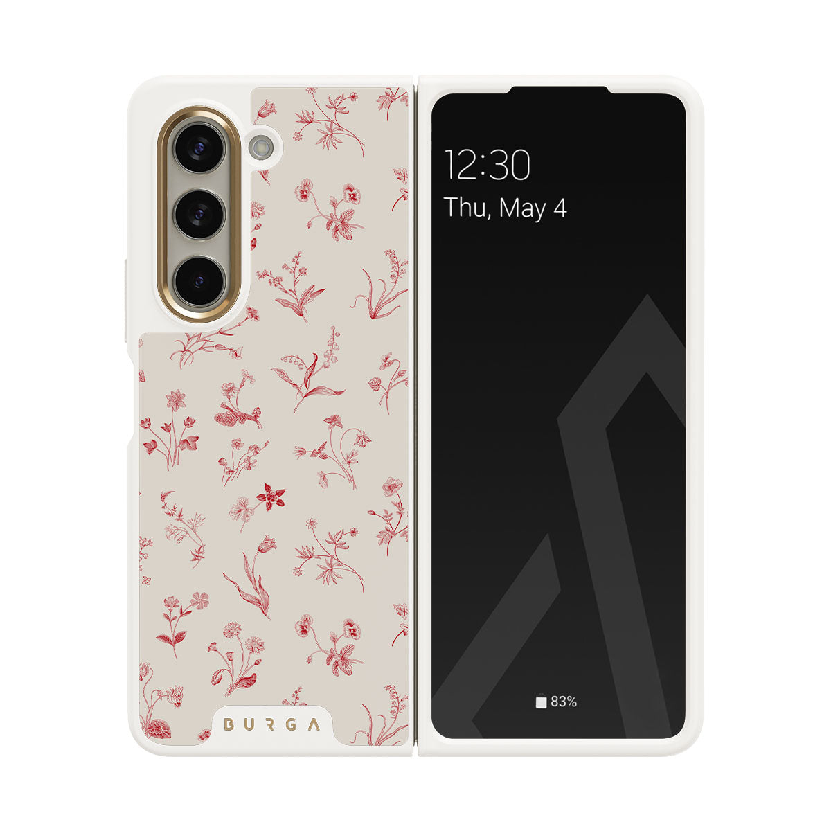 這款手機殼的設計元素包括花卉圖案、復古風格、浪漫情調、乳白色背景和女性風格的印花。