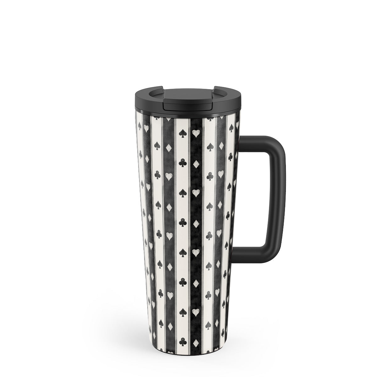 此設計特色: 黑白條紋、紅心、撲克牌花色、復古風格