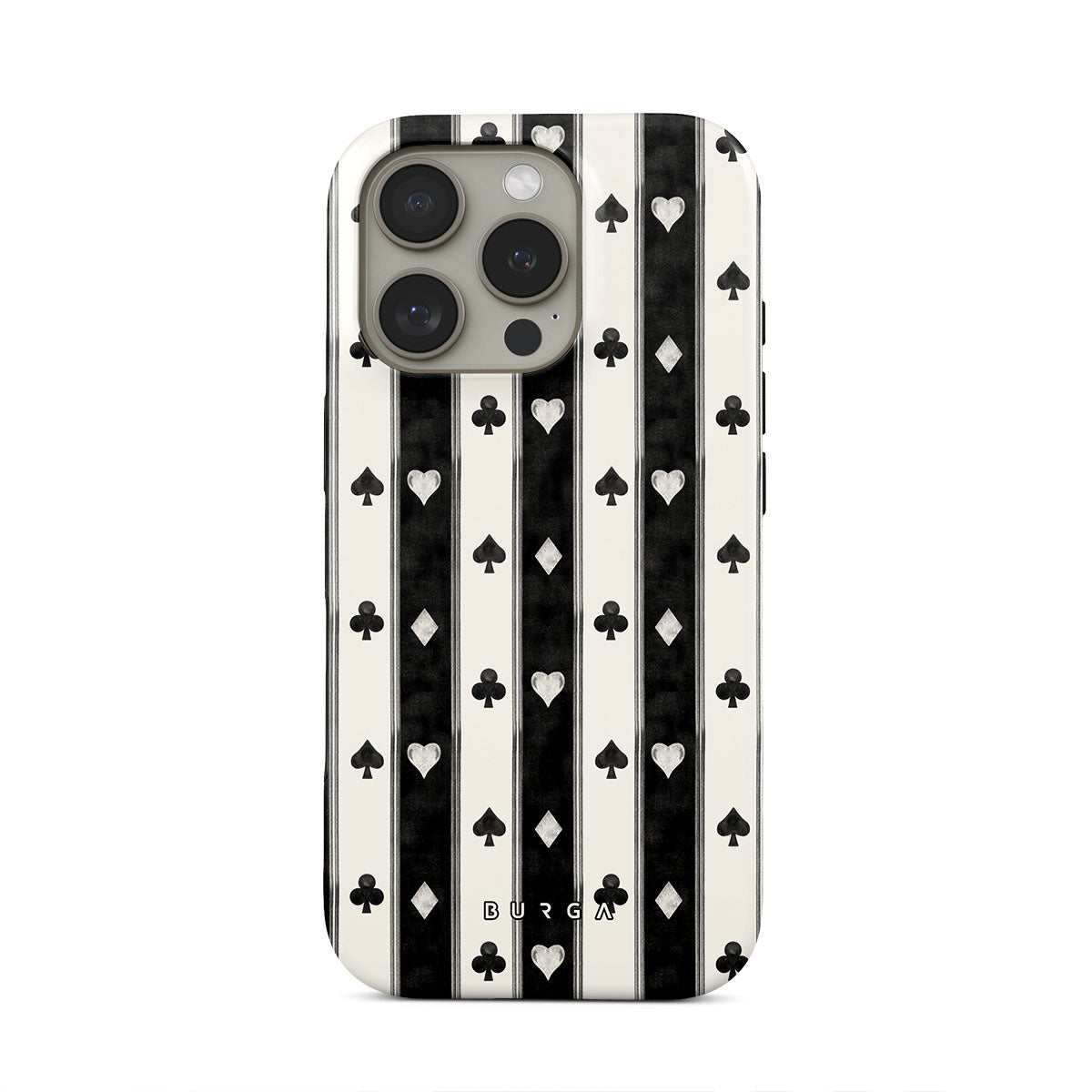 此設計特色: 黑白條紋、紅心、撲克牌花色、復古風格