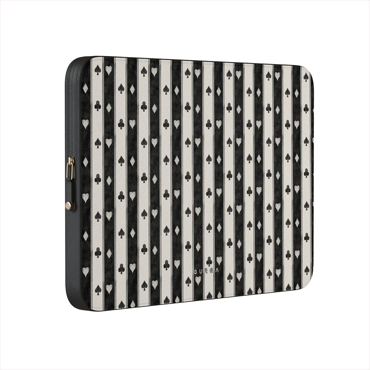 此設計特色: 黑白條紋、紅心、撲克牌花色、復古風格
