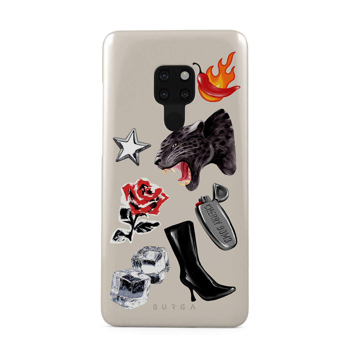 此設計特色:黑豹、紅玫瑰、燃燒的辣椒、銀色打火機、黑色過膝長靴、冰塊、銀色星星