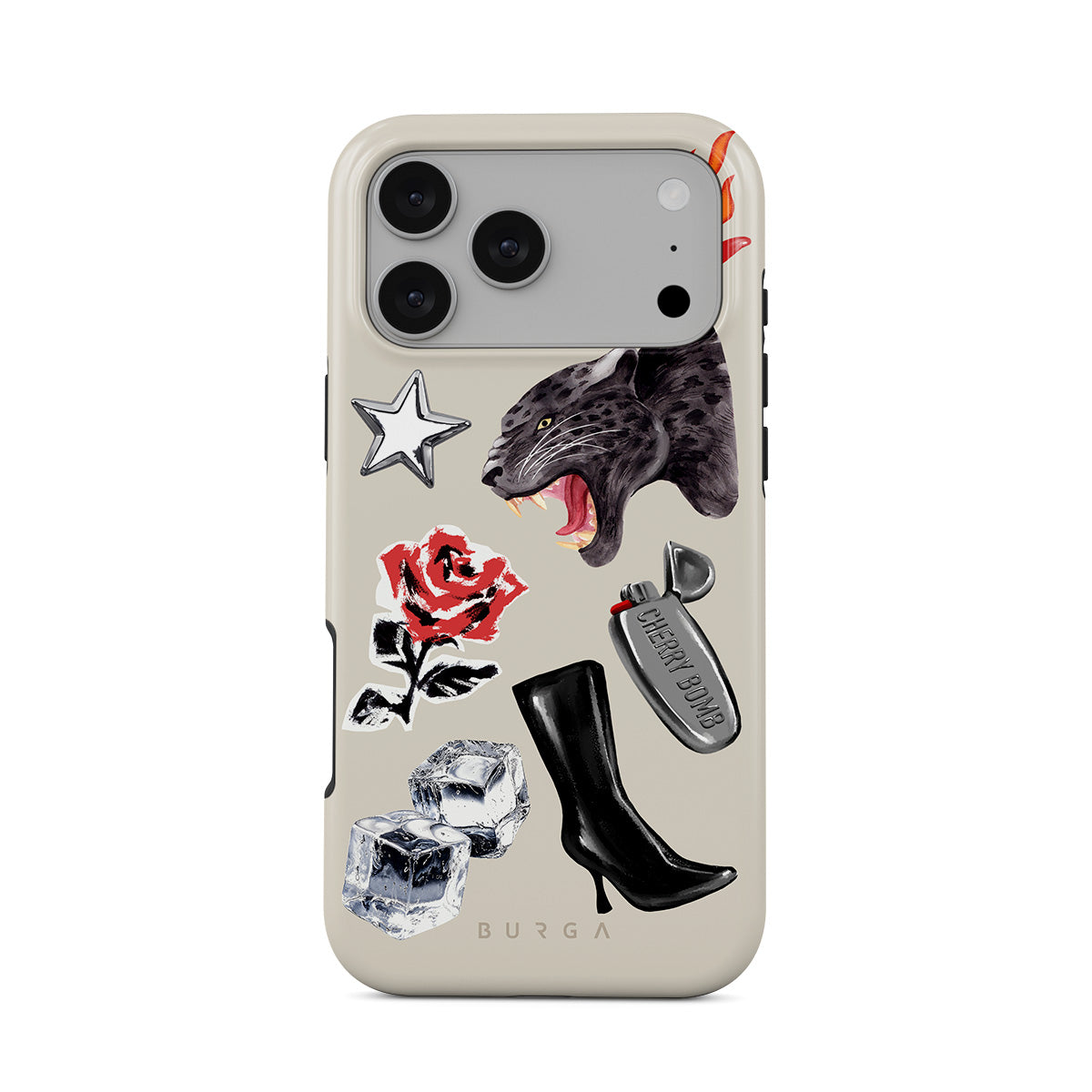 此設計特色:黑豹、紅玫瑰、燃燒的辣椒、銀色打火機、黑色過膝長靴、冰塊、銀色星星