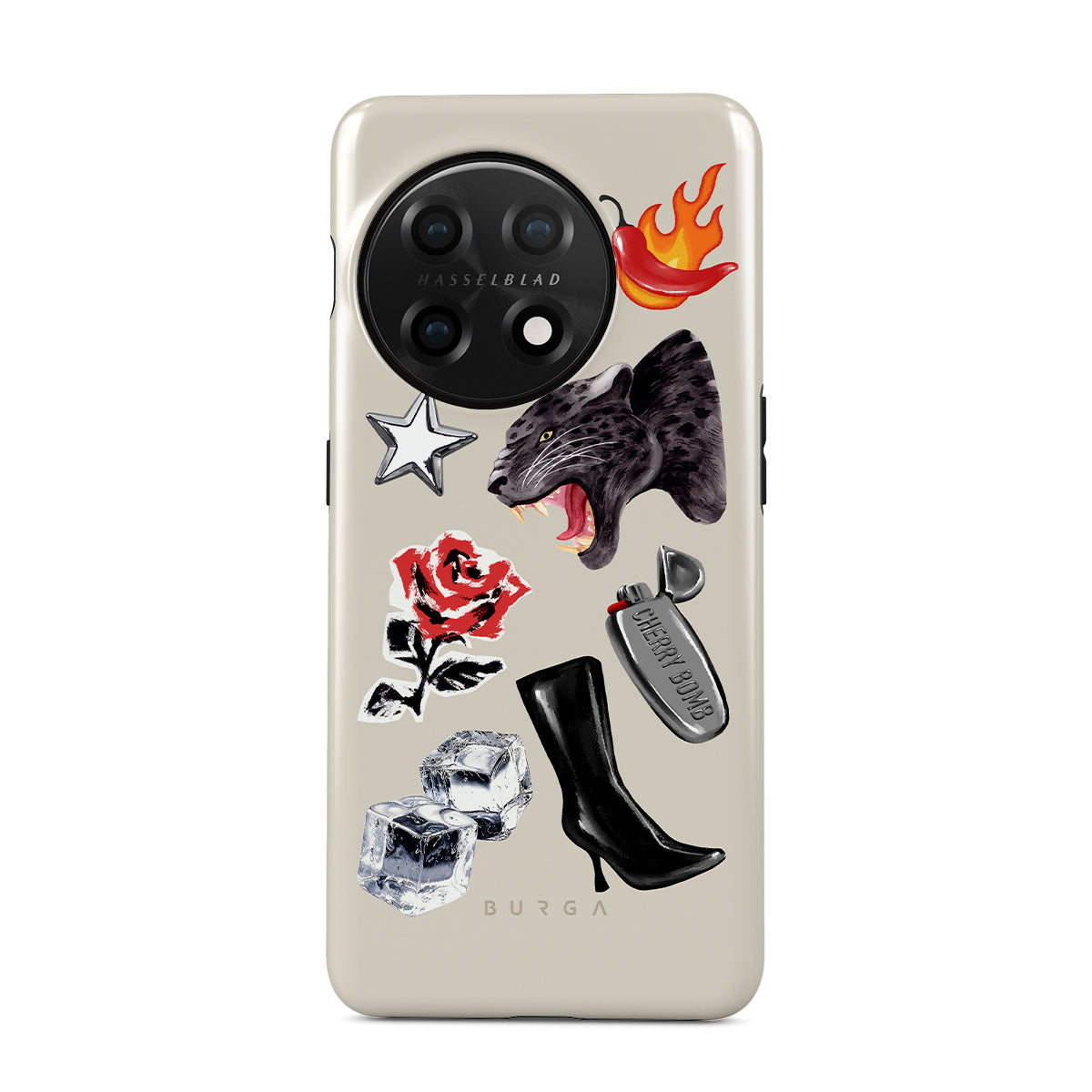 此設計特色:黑豹、紅玫瑰、燃燒的辣椒、銀色打火機、黑色過膝長靴、冰塊、銀色星星