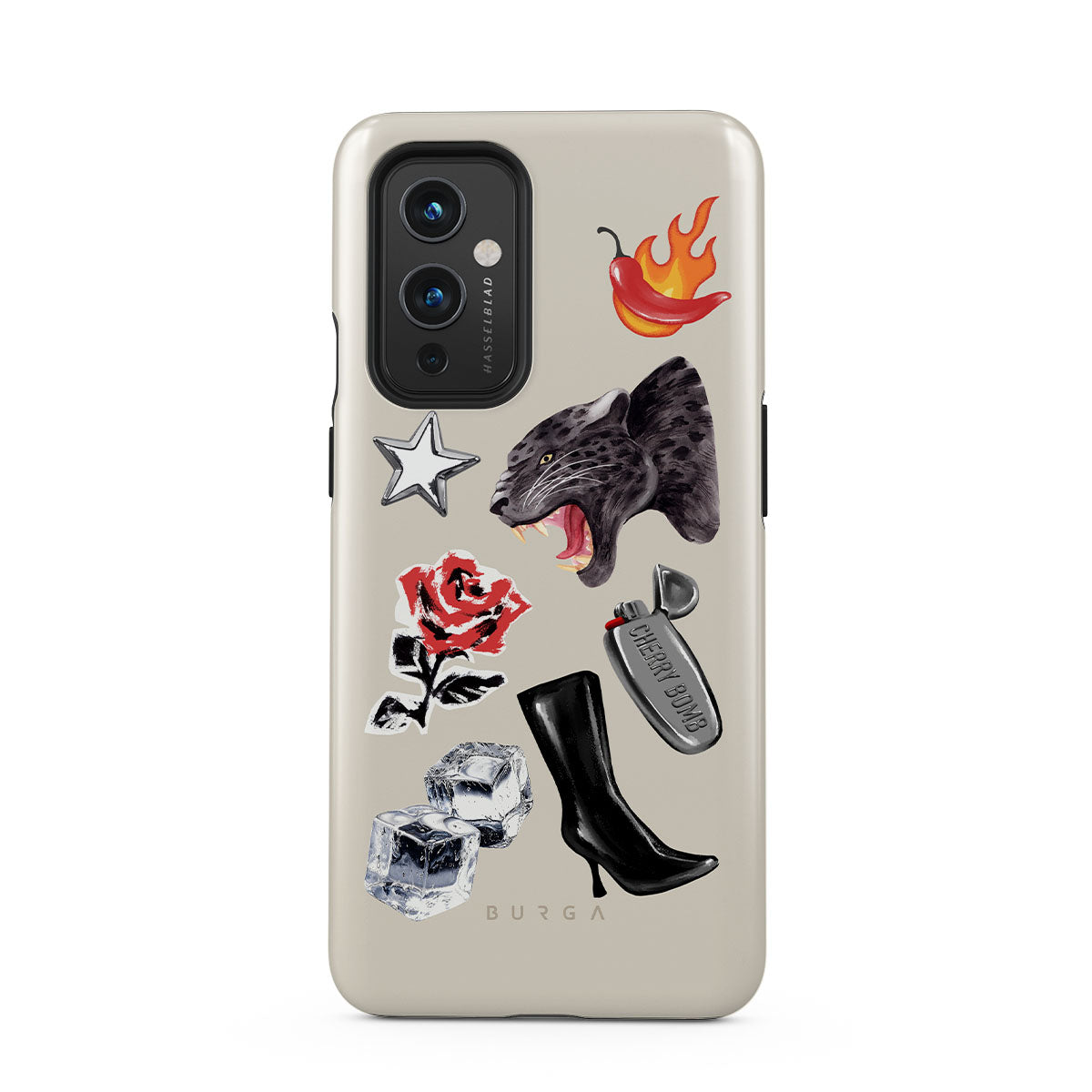 此設計特色:黑豹、紅玫瑰、燃燒的辣椒、銀色打火機、黑色過膝長靴、冰塊、銀色星星