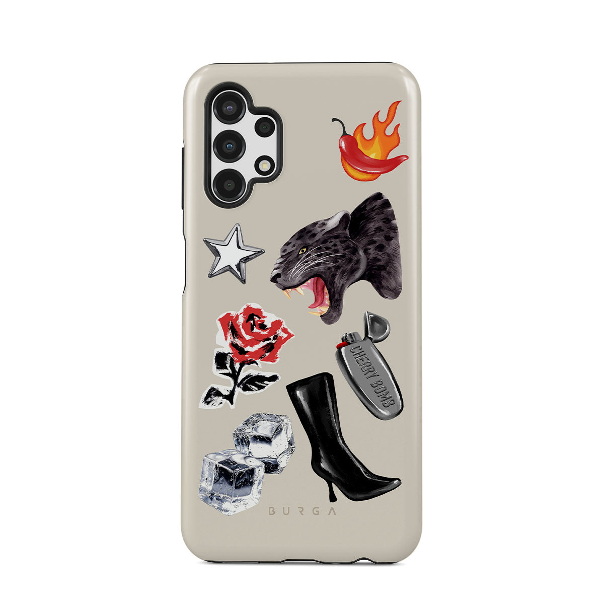 此設計特色:黑豹、紅玫瑰、燃燒的辣椒、銀色打火機、黑色過膝長靴、冰塊、銀色星星