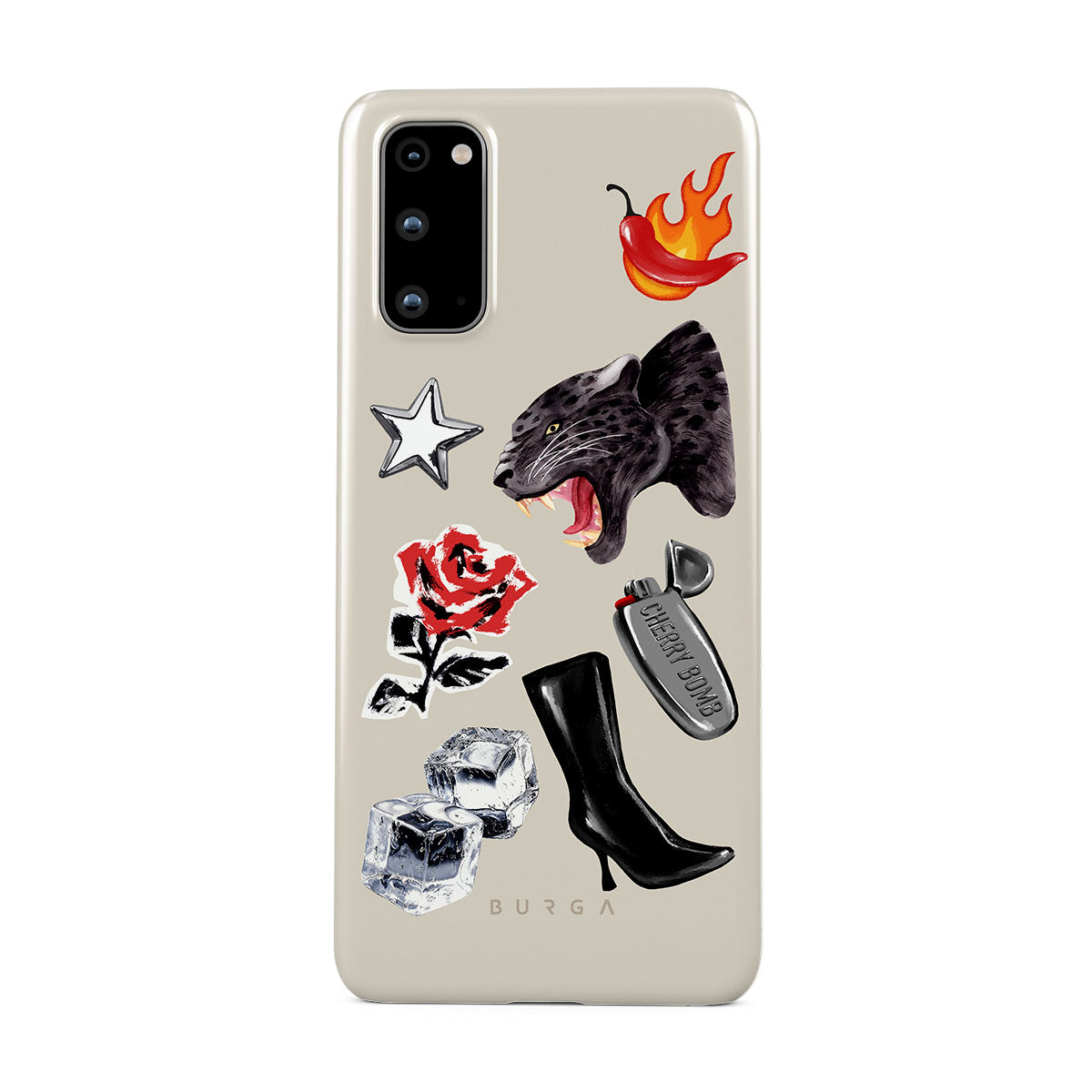 此設計特色:黑豹、紅玫瑰、燃燒的辣椒、銀色打火機、黑色過膝長靴、冰塊、銀色星星