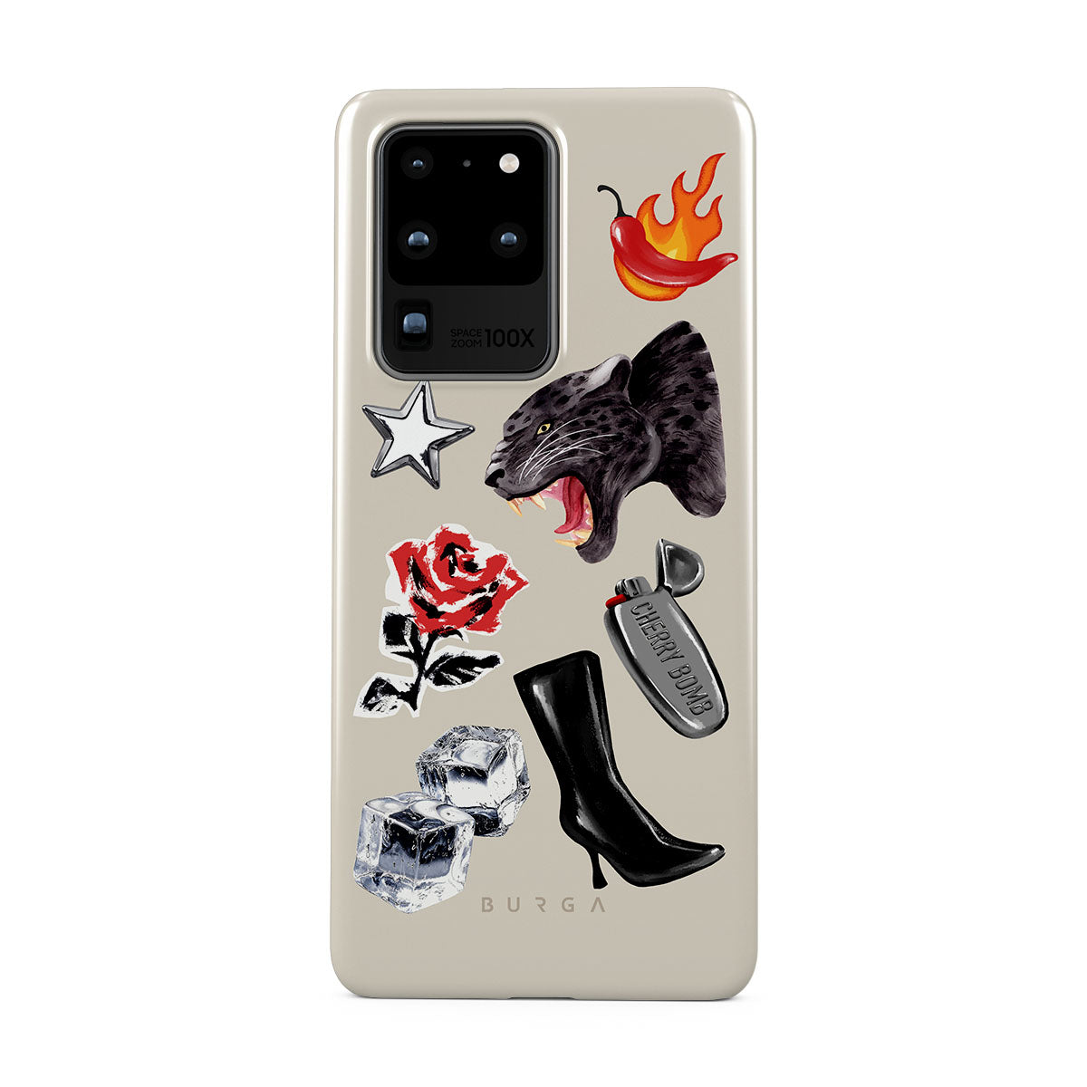 此設計特色:黑豹、紅玫瑰、燃燒的辣椒、銀色打火機、黑色過膝長靴、冰塊、銀色星星