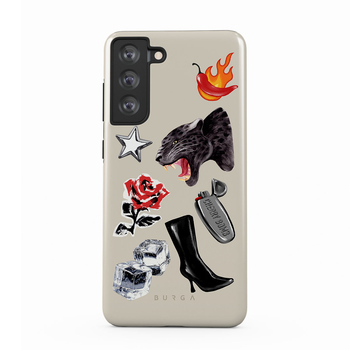 此設計特色:黑豹、紅玫瑰、燃燒的辣椒、銀色打火機、黑色過膝長靴、冰塊、銀色星星