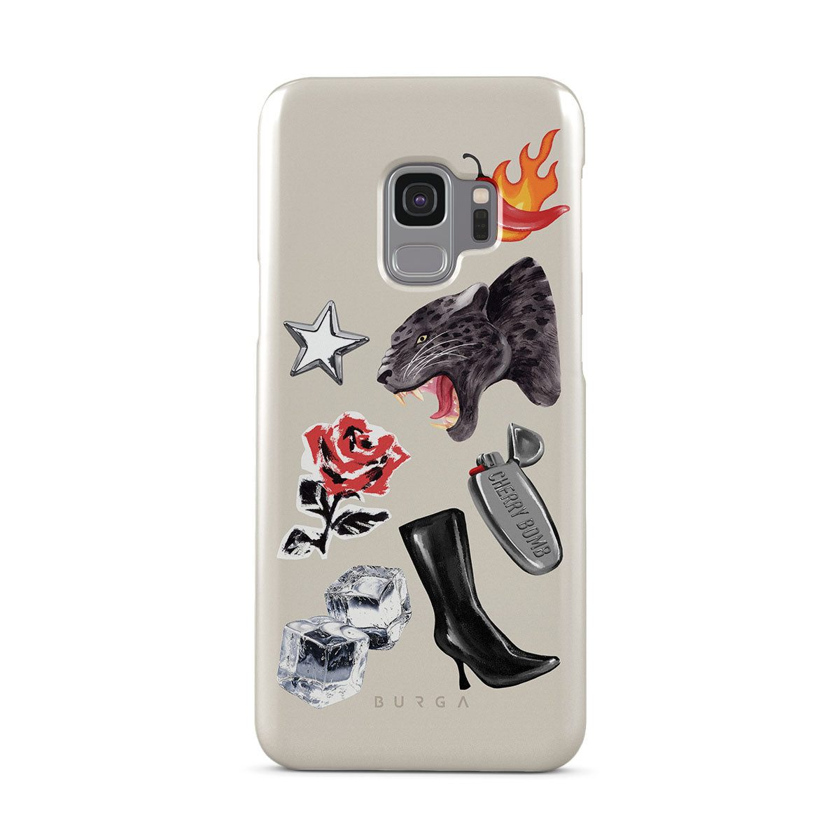 此設計特色:黑豹、紅玫瑰、燃燒的辣椒、銀色打火機、黑色過膝長靴、冰塊、銀色星星