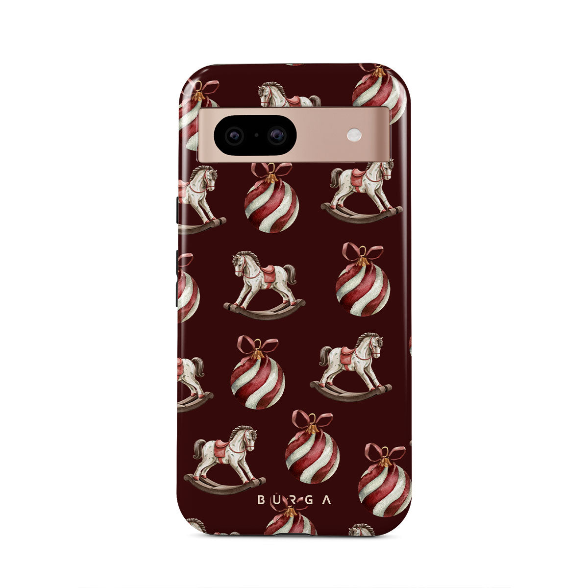設計元素包含:木馬、裝飾球、紅色、聖誕圖案