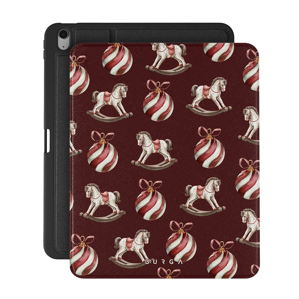 設計元素包含:木馬、裝飾球、紅色、聖誕圖案