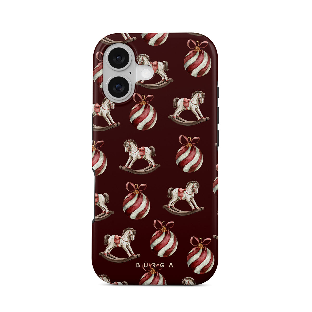 設計元素包含:木馬、裝飾球、紅色、聖誕圖案