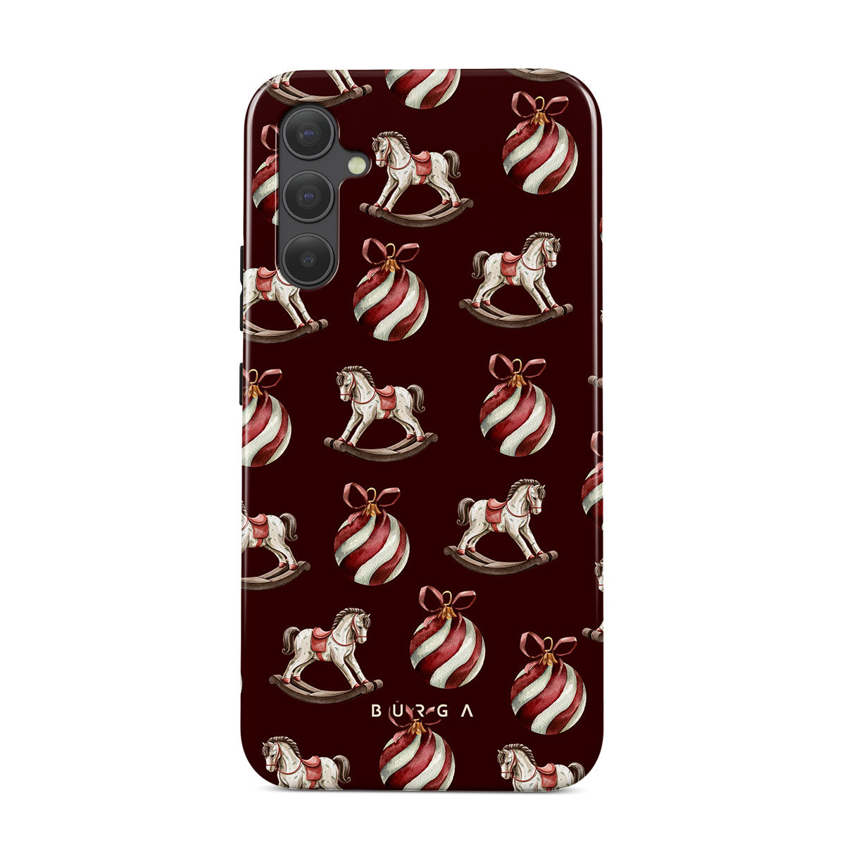 設計元素包含:木馬、裝飾球、紅色、聖誕圖案