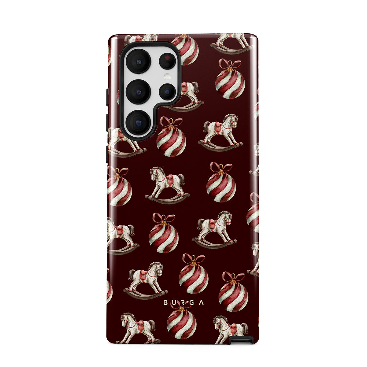 設計元素包含:木馬、裝飾球、紅色、聖誕圖案