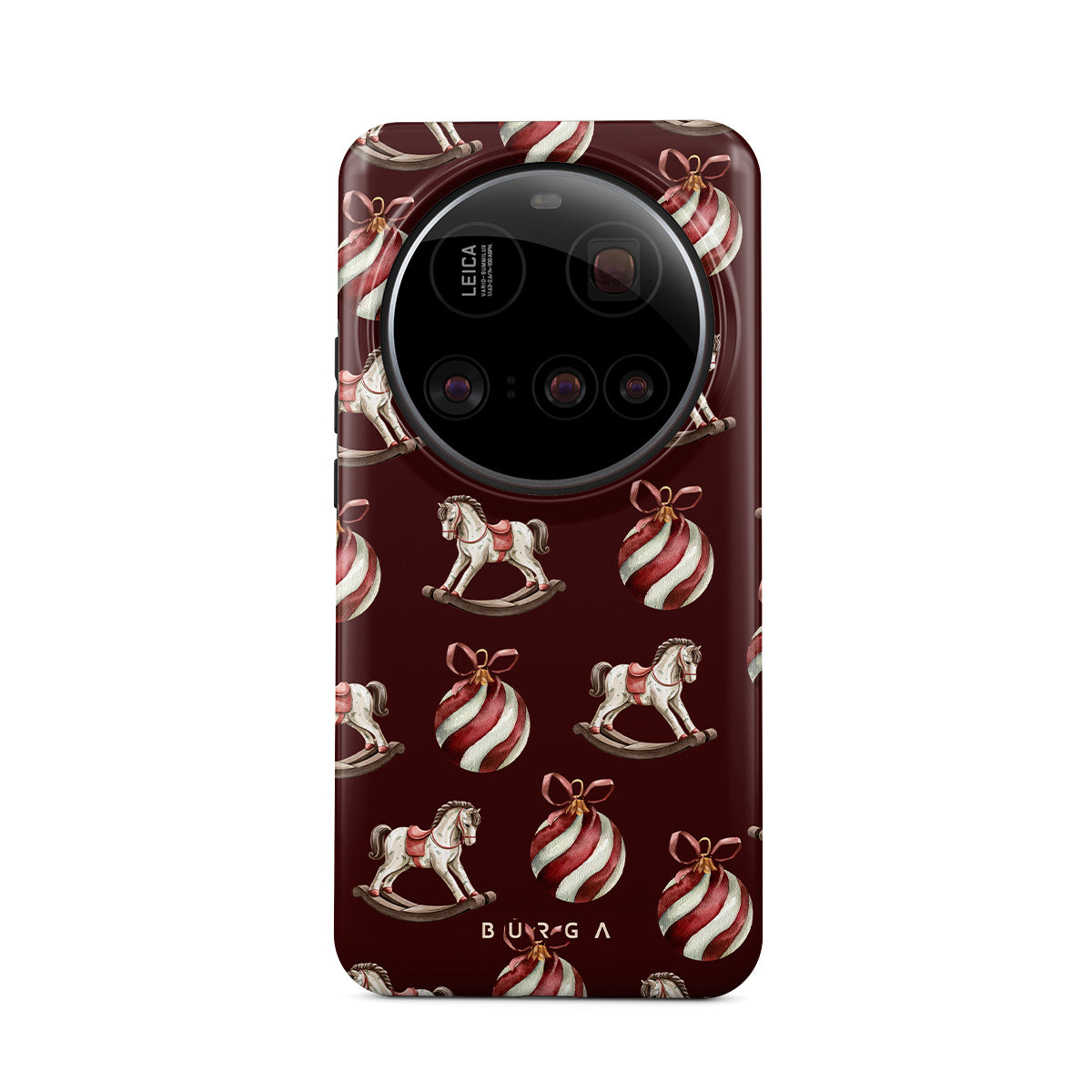 設計元素包含:木馬、裝飾球、紅色、聖誕圖案