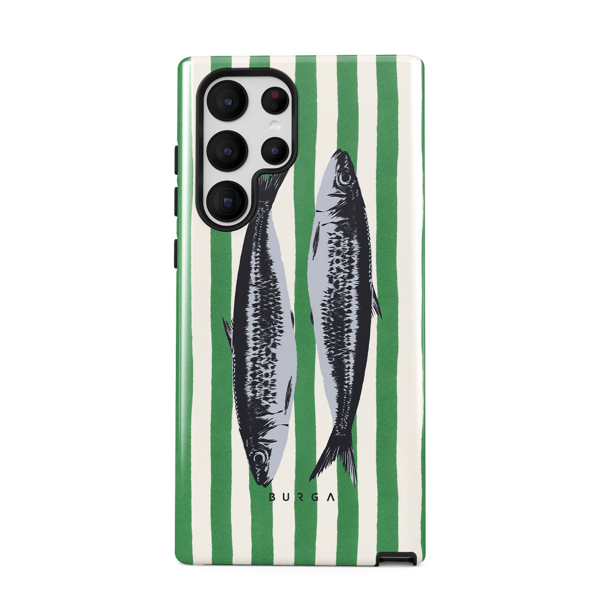 此設計特色:沙丁魚、綠色條紋、海洋圖案