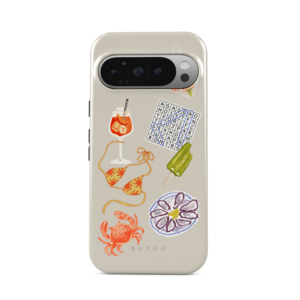 此設計特色:螃蟹、生蠔拼盤、冰棒、填字遊戲、Spritz雞尾酒、比基尼上衣、水果