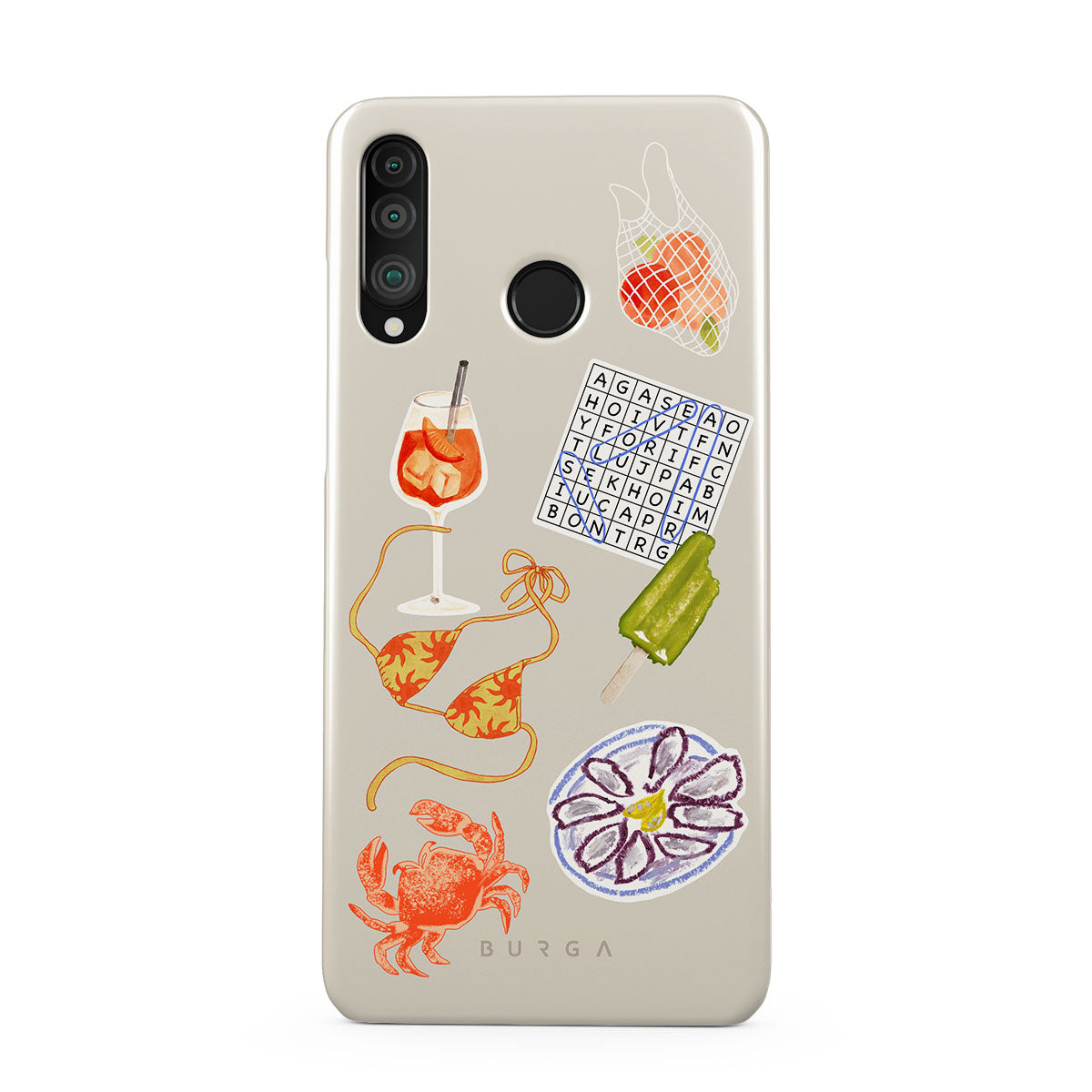 此設計特色:螃蟹、生蠔拼盤、冰棒、填字遊戲、Spritz雞尾酒、比基尼上衣、水果