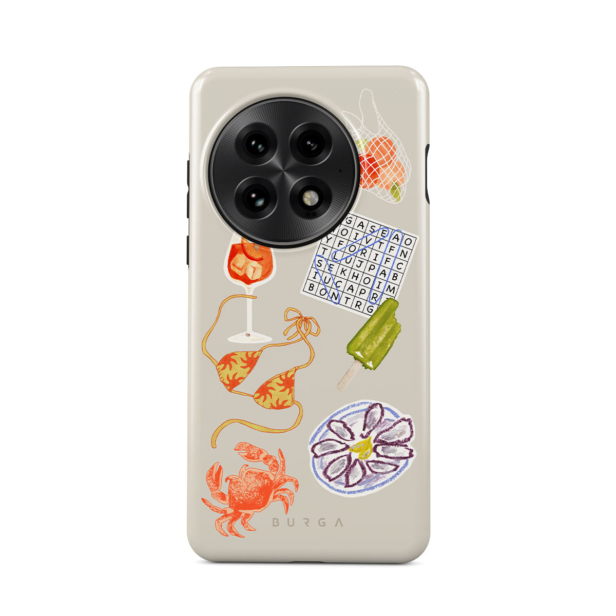 此設計特色:螃蟹、生蠔拼盤、冰棒、填字遊戲、Spritz雞尾酒、比基尼上衣、水果