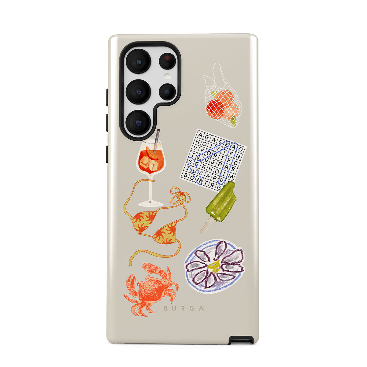 此設計特色:螃蟹、生蠔拼盤、冰棒、填字遊戲、Spritz雞尾酒、比基尼上衣、水果