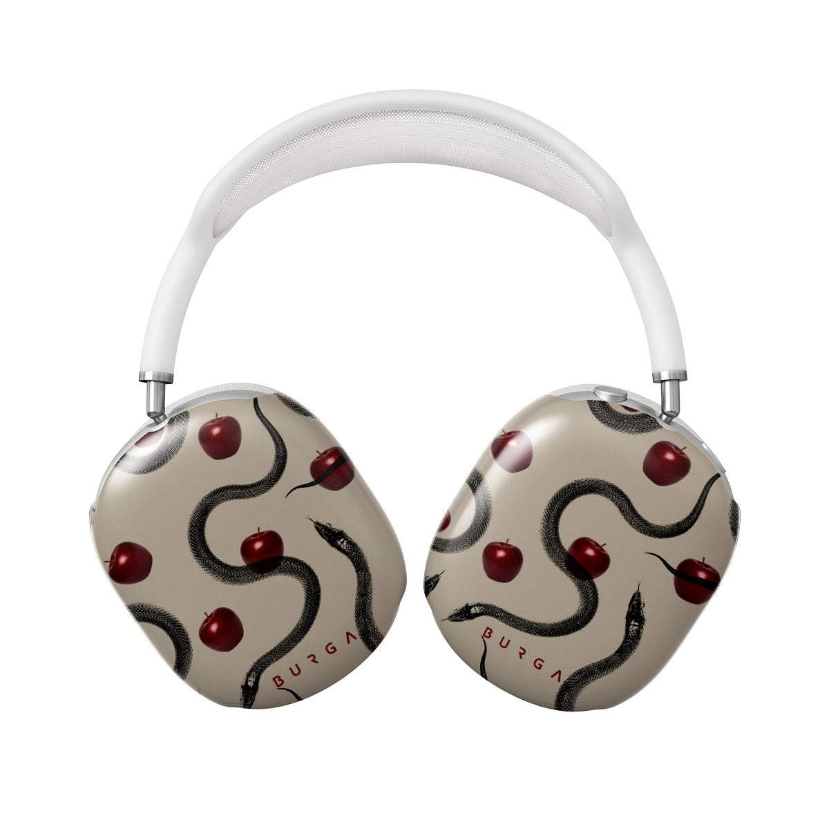 此設計包含:光滑的紅色蘋果、盤繞的蛇、米色調。