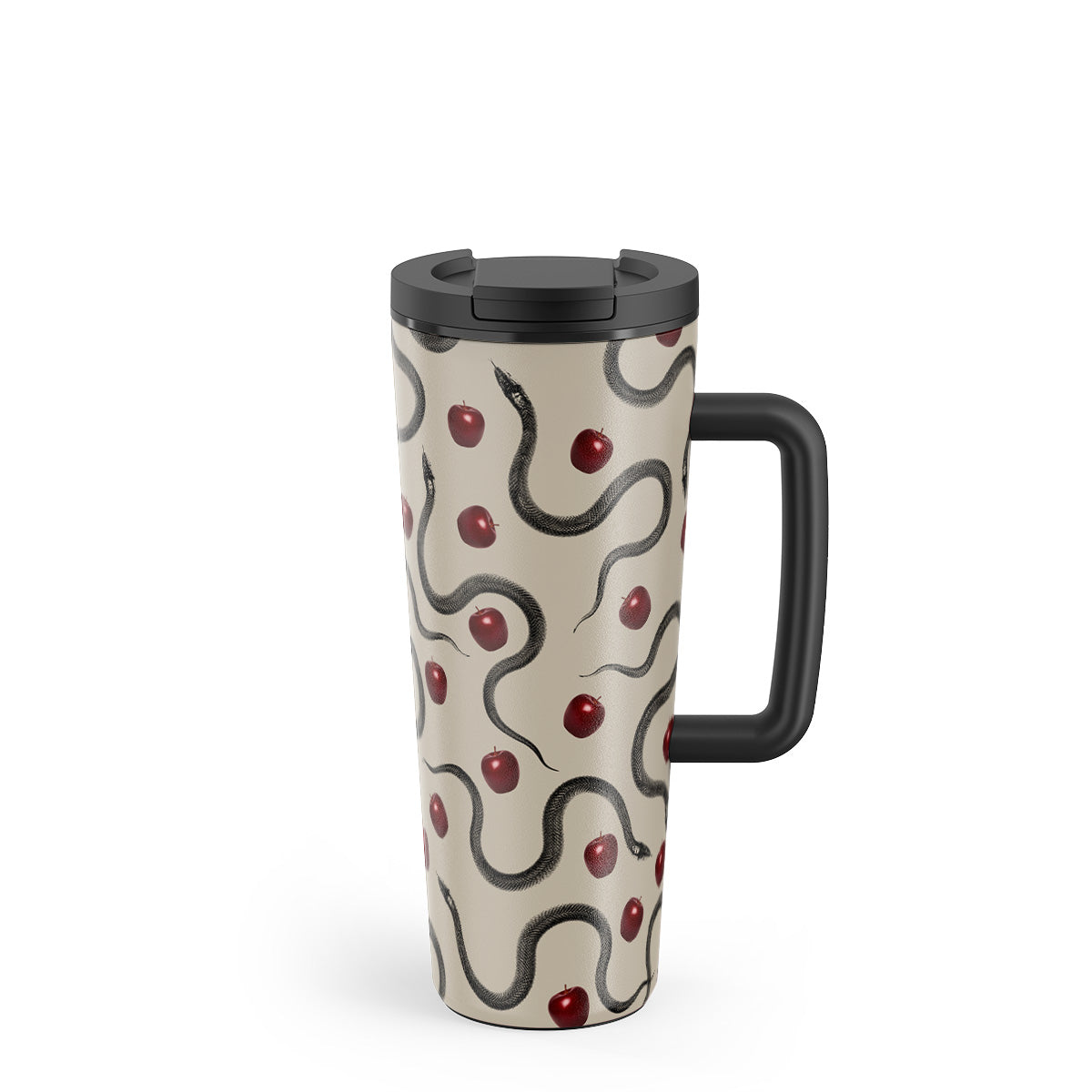 此設計包含:光滑的紅色蘋果、盤繞的蛇、米色調。