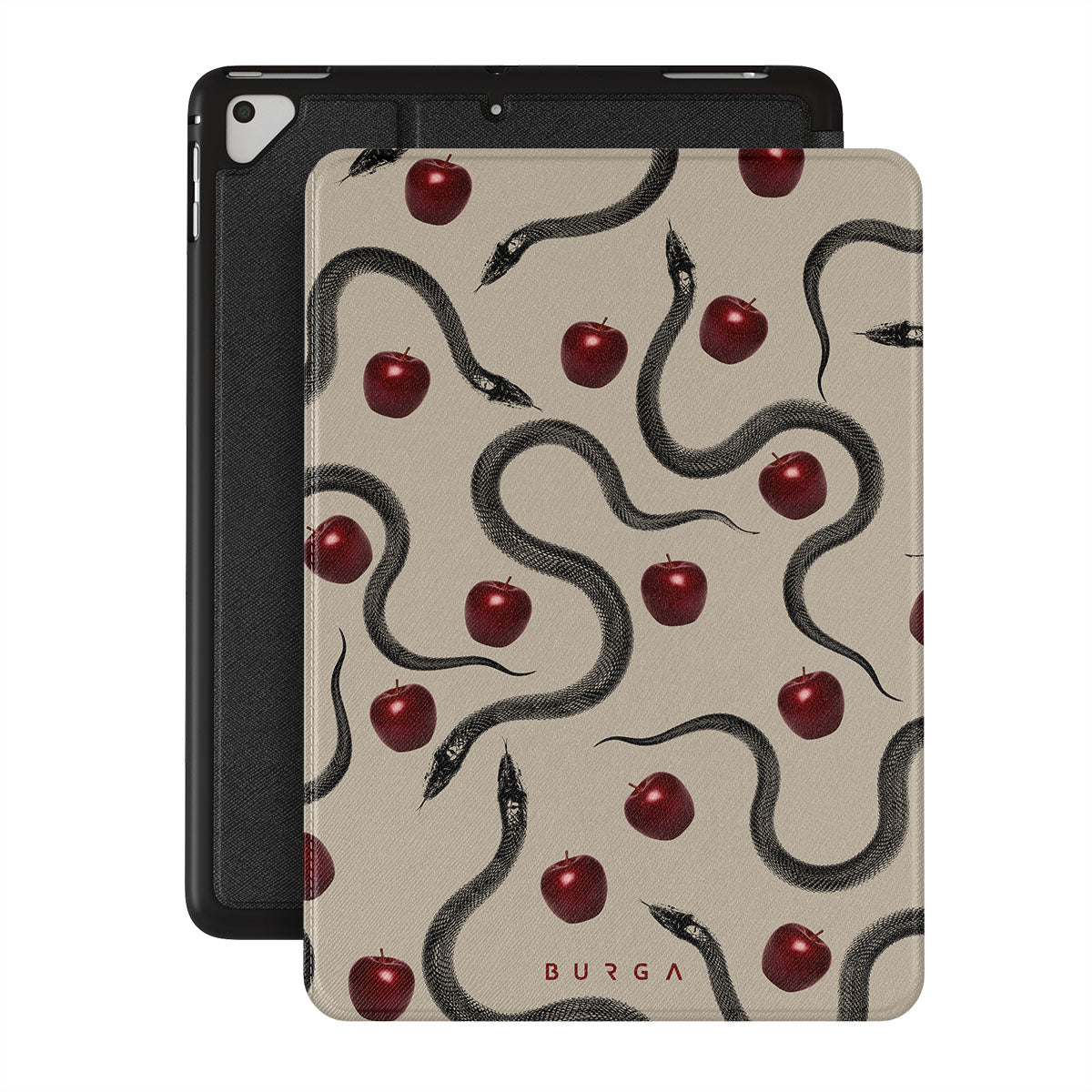 此設計包含:光滑的紅色蘋果、盤繞的蛇、米色調。