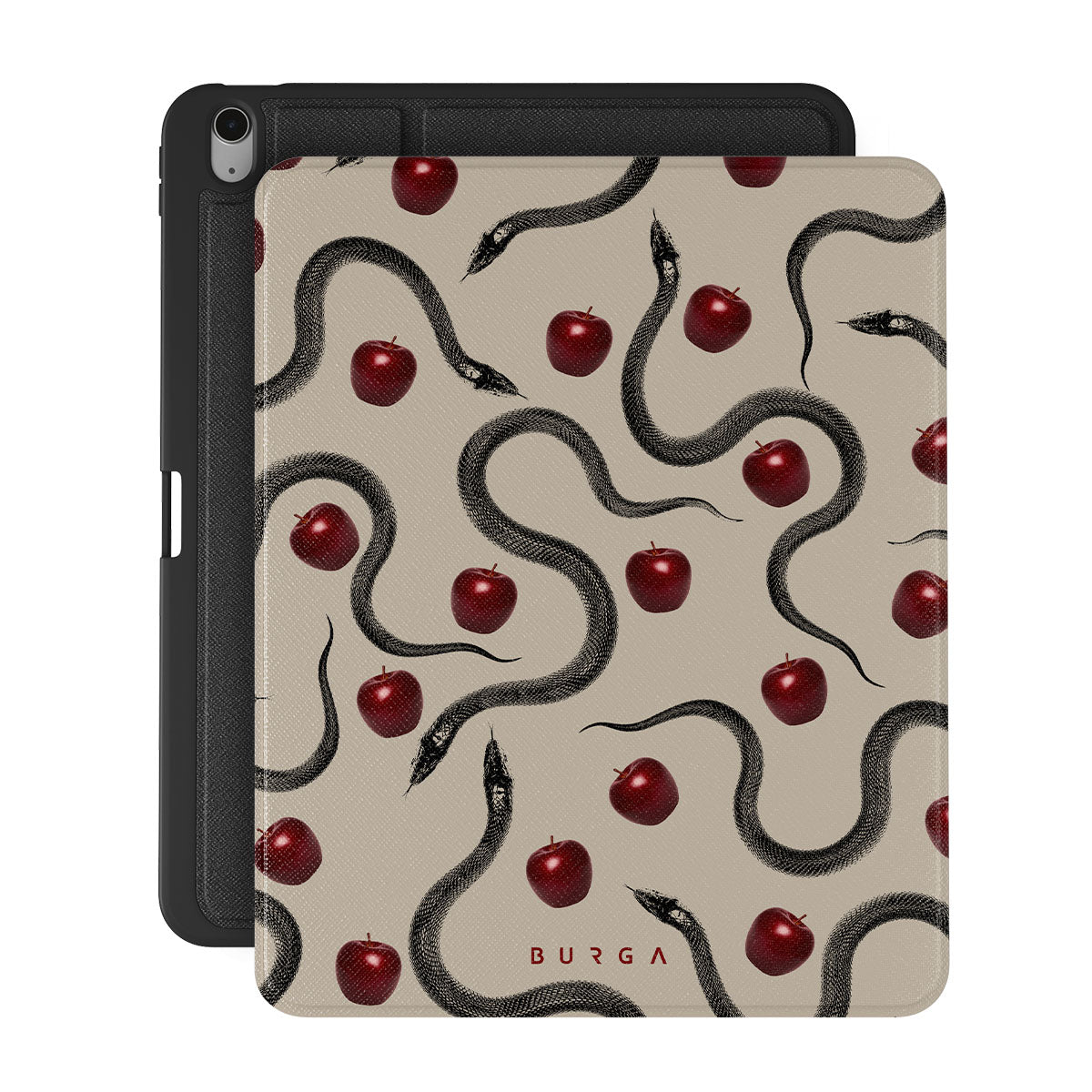 此設計包含:光滑的紅色蘋果、盤繞的蛇、米色調。