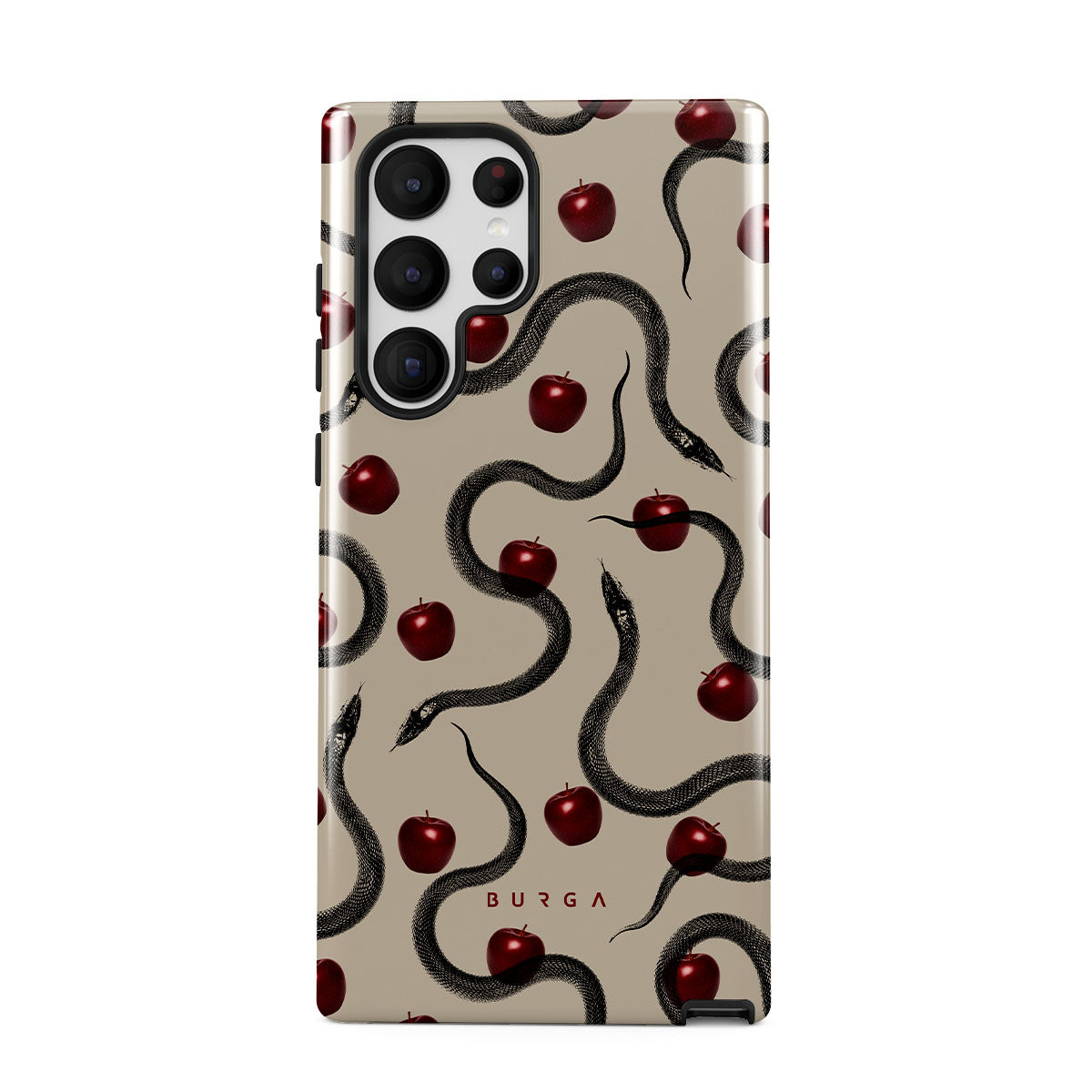 此設計包含:光滑的紅色蘋果、盤繞的蛇、米色調。